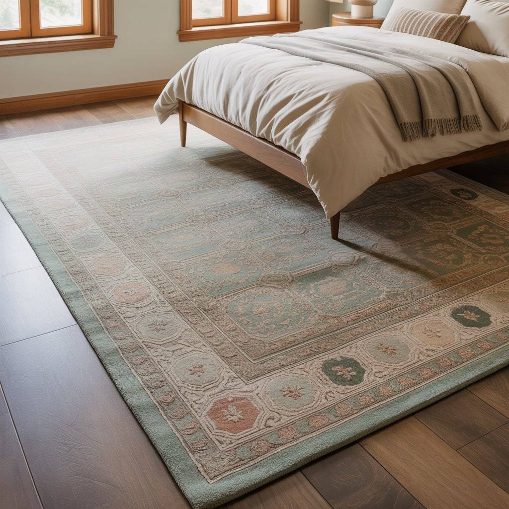 A large rug that extends beyond the bed edges can help create a balanced look. Many people choose 8×10 or 9×12 sizes for standard beds.