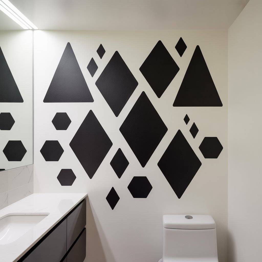 The rest of the walls stay solid white. This gives you that fun, retro diner feel without going overboard. It works great in a kid’s bathroom or a guest bathroom where you want a little personality. To keep it modern, use a soft black instead of jet black. And don’t forget to seal the pattern with a clear matte topcoat so it lasts.