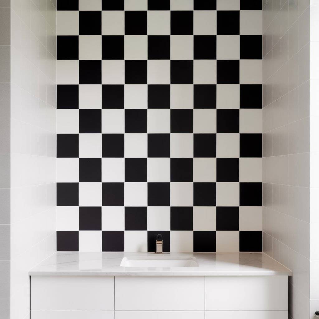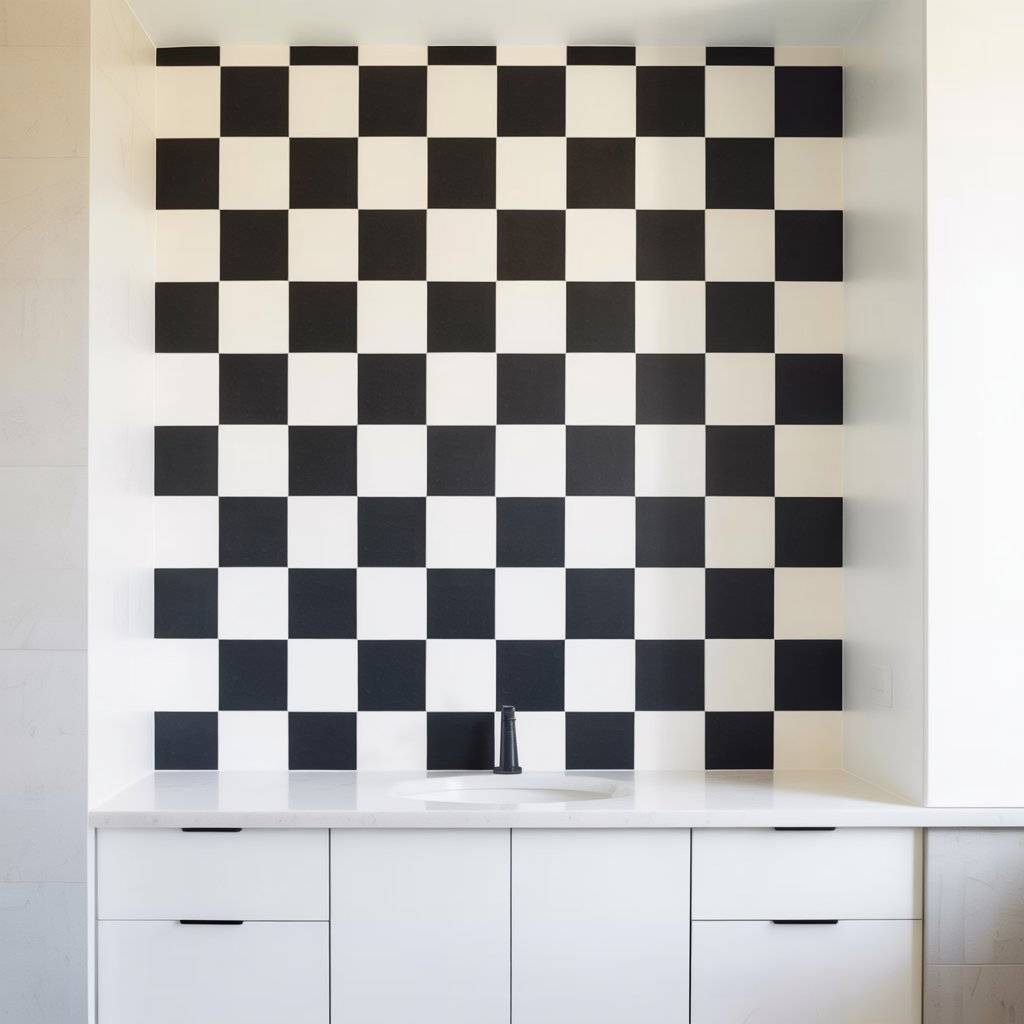 A full checkerboard bathroom can be too busy. Instead, pick one wall maybe the one behind the vanity and paint a checkerboard pattern. Use chalk or a level to draw a grid of 6×6 or 8×8 inch squares. Then fill them in with black and white.