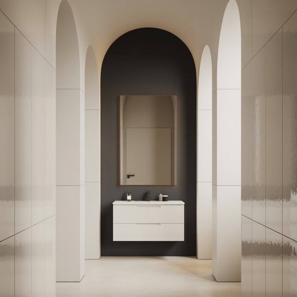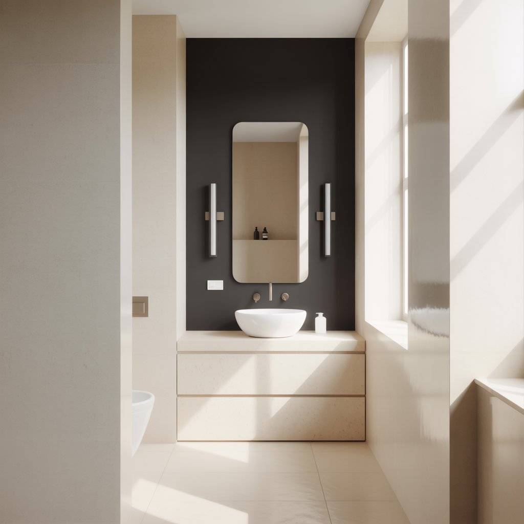 This is where most people should start. Paint three walls a soft, warm white (not a harsh hospital white) and one wall matte black. The black wall becomes a focal point behind the mirror or toilet. It draws your eye and adds instant drama without feeling like a cave.