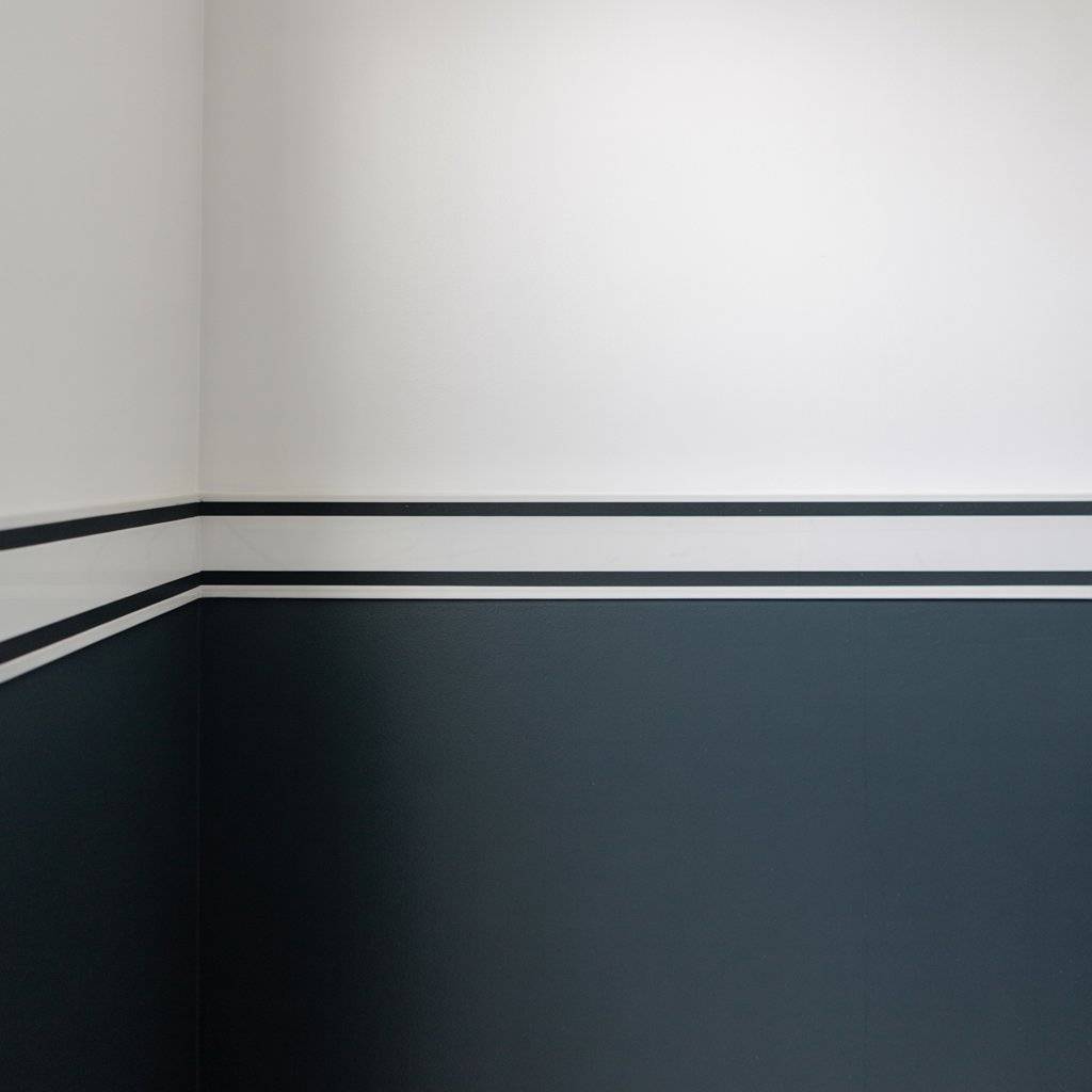 Paint the bottom half of your walls black and the top half white. Split it right in the middle, or do a lower third black and upper two-thirds white. This is called a “chair rail” style even if you don’t install the wood rail.
