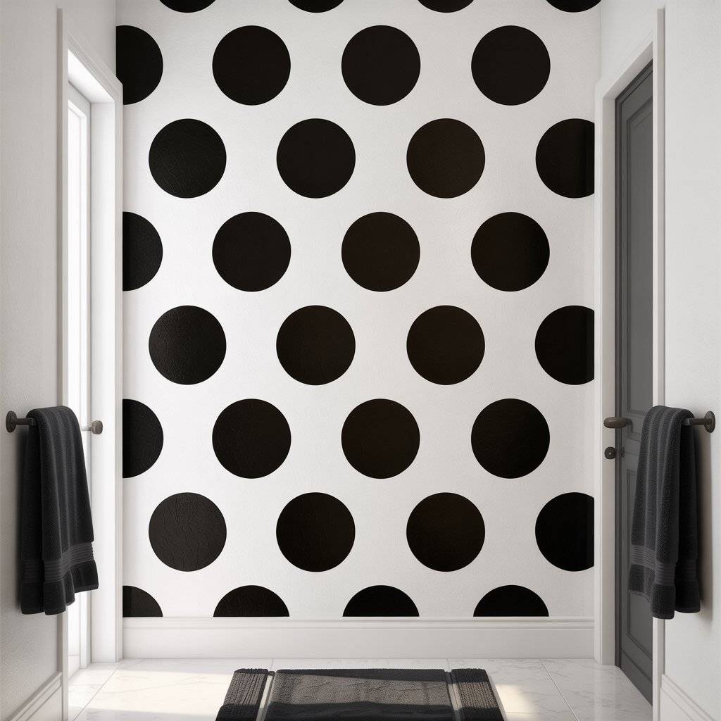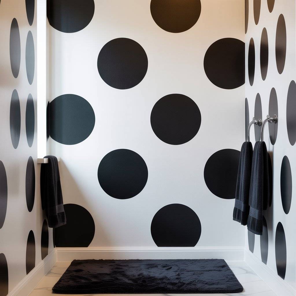 Place them randomly, not in a perfect grid. This works best on one wall or inside a recessed niche. It gives the bathroom a custom wallpaper look for almost no money. Keep the other walls solid white. Add black towels and a black rug to tie it together. This is a great rental-friendly idea if you use removable vinyl dots instead of paint.