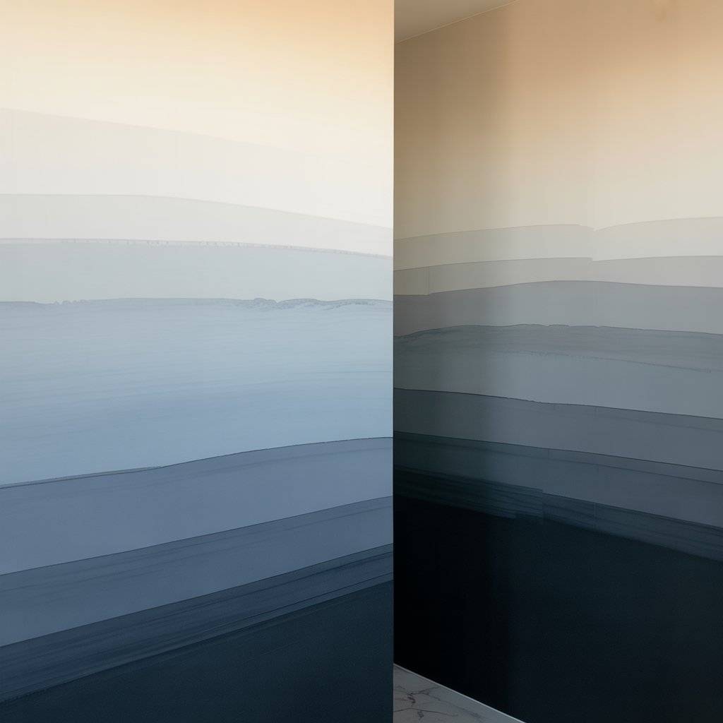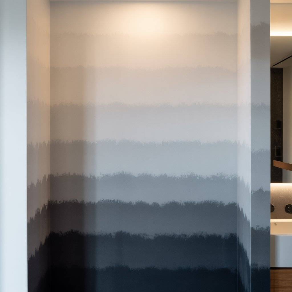 Paint horizontal bands and blend the edges while wet. The result is soft and dreamy. It works best in a bathroom with no windows because the fade doesn’t fight with natural light. This idea takes practice, so watch a couple of YouTube videos first.