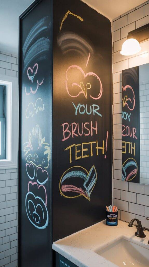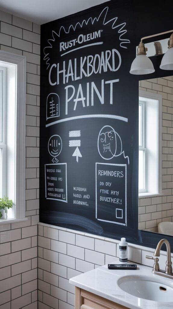 It’s interactive and fun. Use a few coats of chalkboard paint and let it cure for three days before you write on it. Keep a small bowl of chalk and an eraser on the back of the toilet. This idea works great in a family bathroom or a basement bathroom. Just don’t use it in a steamy bathroom without good ventilation, or the chalk won’t stick as well.