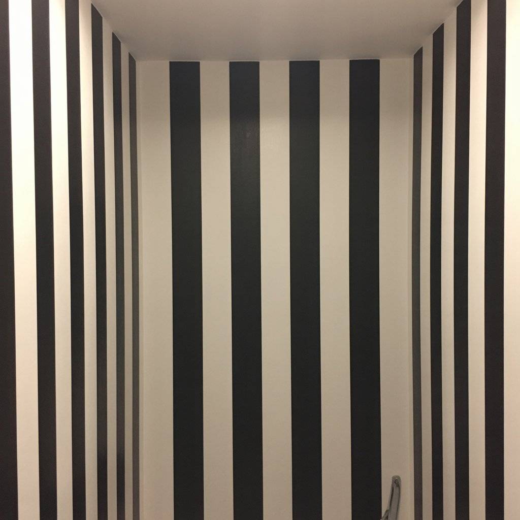 The vertical lines trick your eye into thinking the room has more height. This is especially good for powder rooms or half-baths. Just be patient with the taping. It takes a couple of hours, but the result looks like wallpaper, only cheaper and more durable.