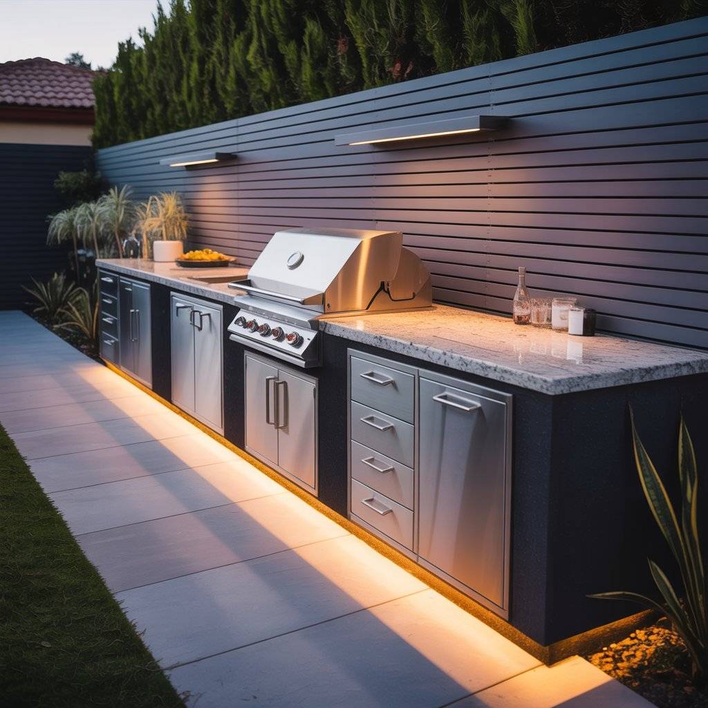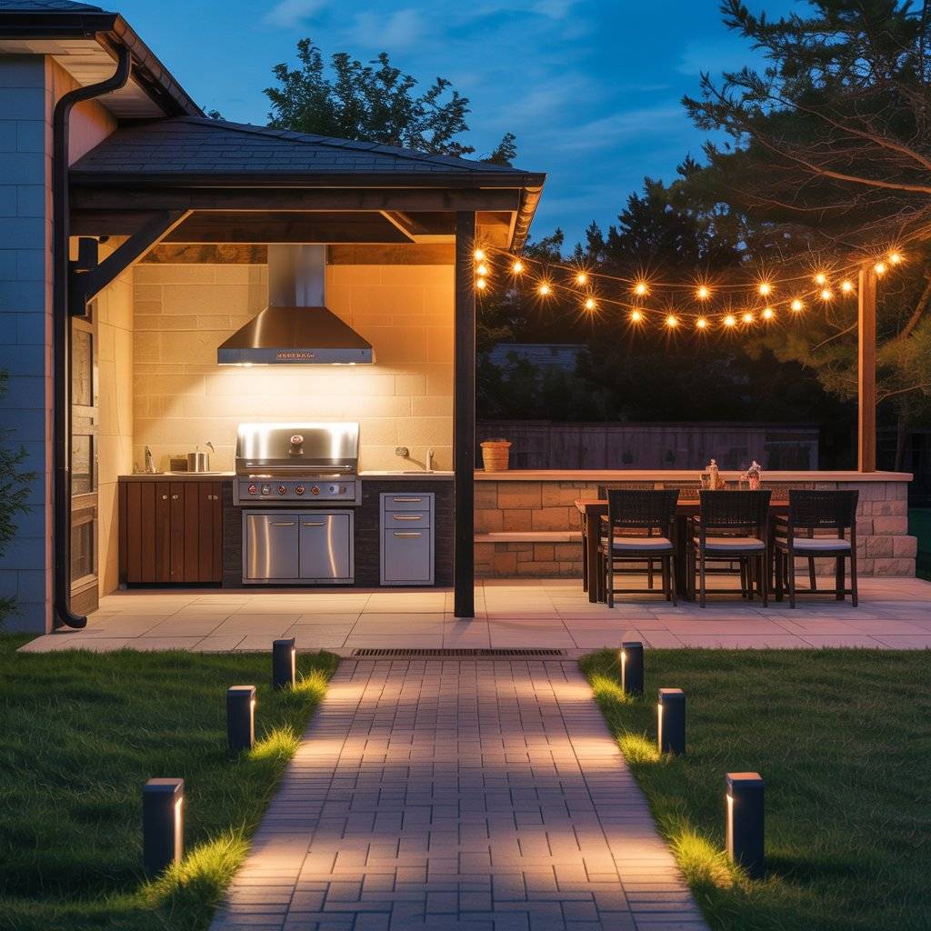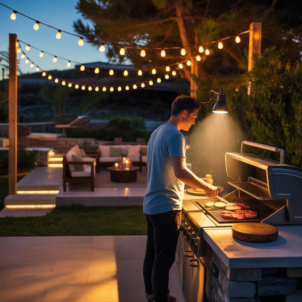 Cooking by phone flashlight is not a plan. Fit a focused task light over your grill and prep area so you can actually see what you’re doing after sunset. Add softer ambient lighting where people sit, and low markers along steps and pathways.