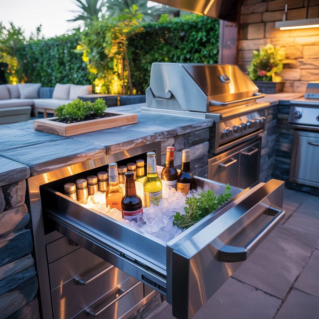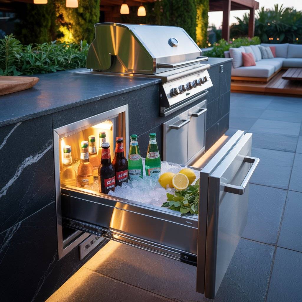 If you’re mainly storing drinks and a few ingredients, a pull-out cooler drawer might be all you need. It takes up less space than a full refrigerator and doesn’t require electricity. Guests can grab a drink without crowding the cook, and you stay hydrated without leaving the grill.