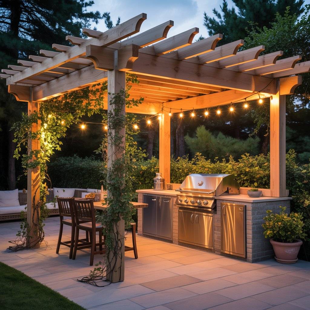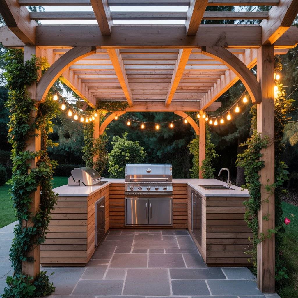 A pergola does two things for a small outdoor kitchen: it defines the space without walls, and it protects you and your appliances from sun and rain. Even a modest overhead structure makes the space feel like a room instead of just a grill sitting on a patio.