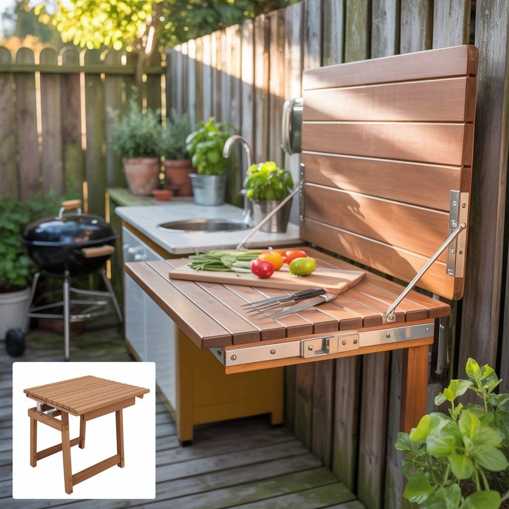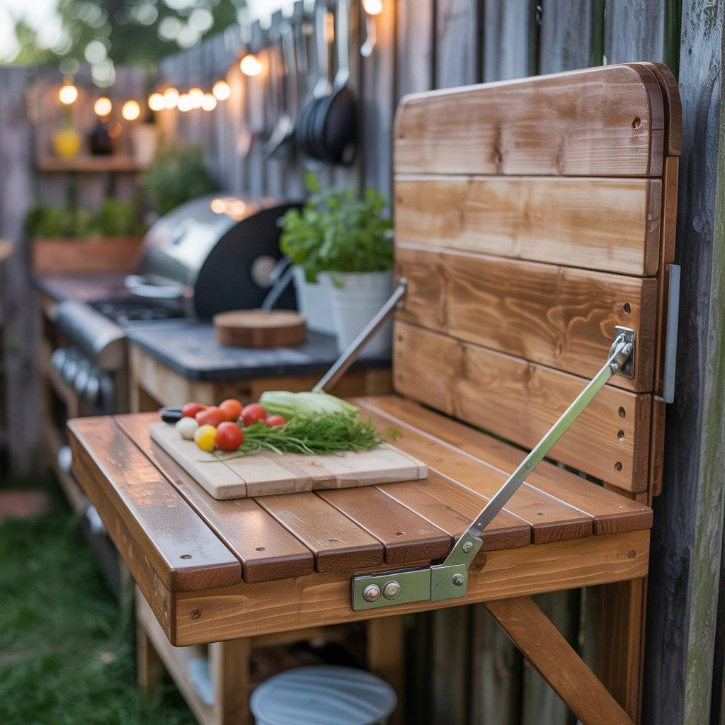 Wall space is valuable in a small outdoor kitchen. A fold-down table mounted to a fence or exterior wall turns into a prep surface when you need it and disappears when you don’t. Use exterior-grade hardware and seal the wood properly so it holds up to weather.