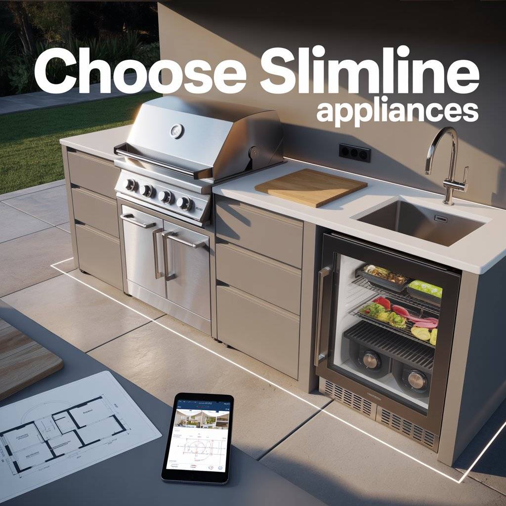 You don’t need full-size everything. Compact grills, mini-fridges, and narrow sinks are designed specifically for tight spaces. A 28-inch grill can feed a crowd just fine, and an undercounter fridge drawer keeps drinks cold without a bulky cabinet.
