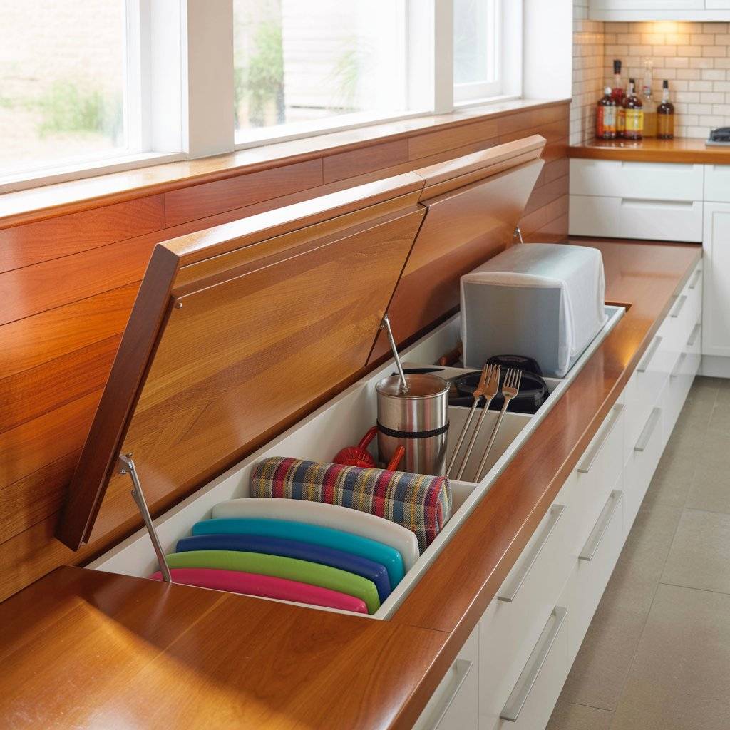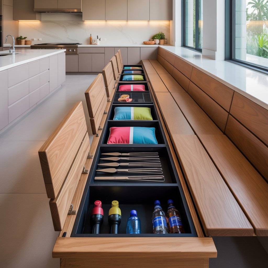 Instead of bulky chairs that take up floor space, consider a built-in bench along one side of your kitchen. The space underneath can hold cushions, grill tools, or even a stash of drinks. It doubles as seating and storage without adding clutter.