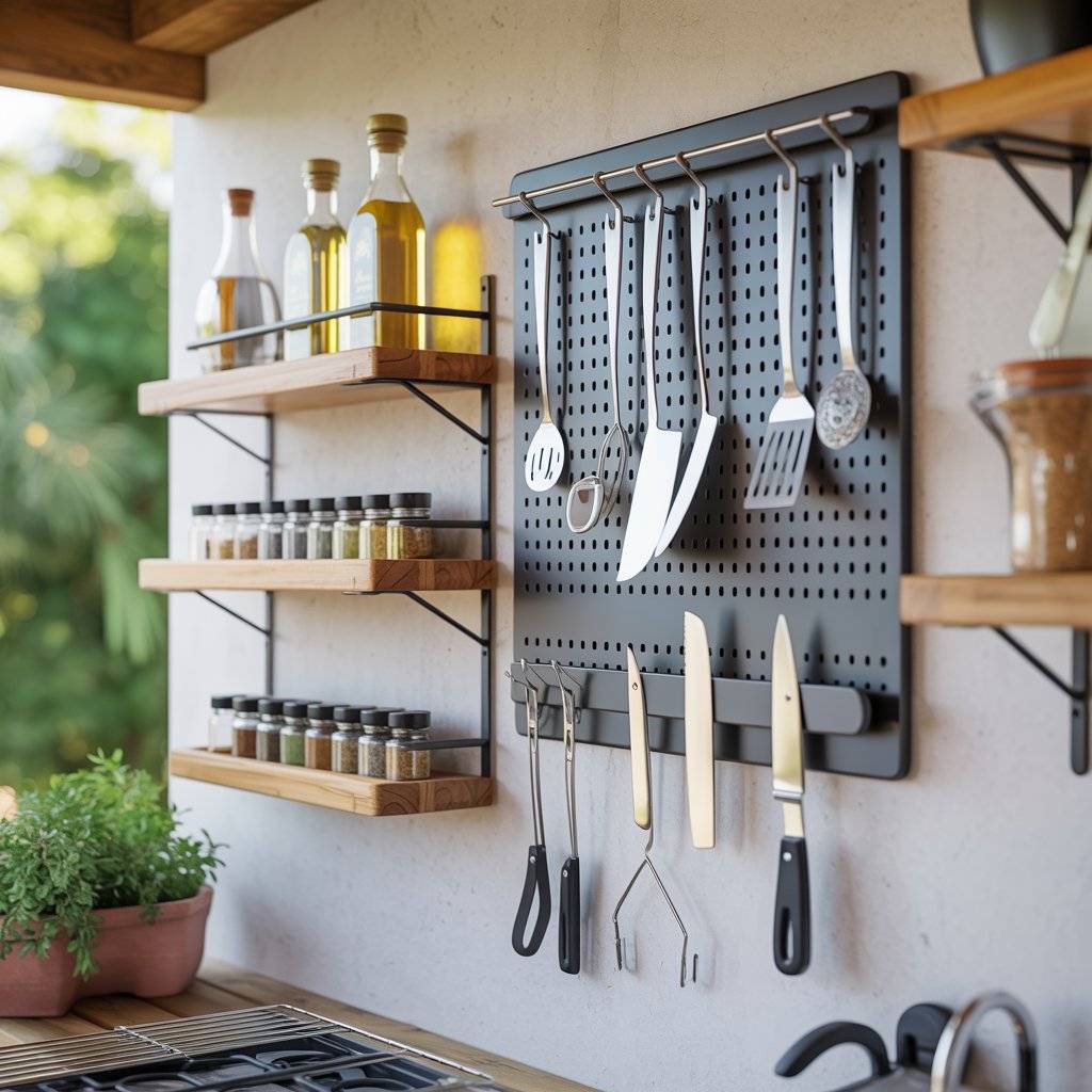 One client’s patio wall became a full kitchen organizer hooks for spatulas, a rack for spices, and a small shelf for oil and vinegar. The whole thing took up zero floor space and made cooking outdoors genuinely easier.