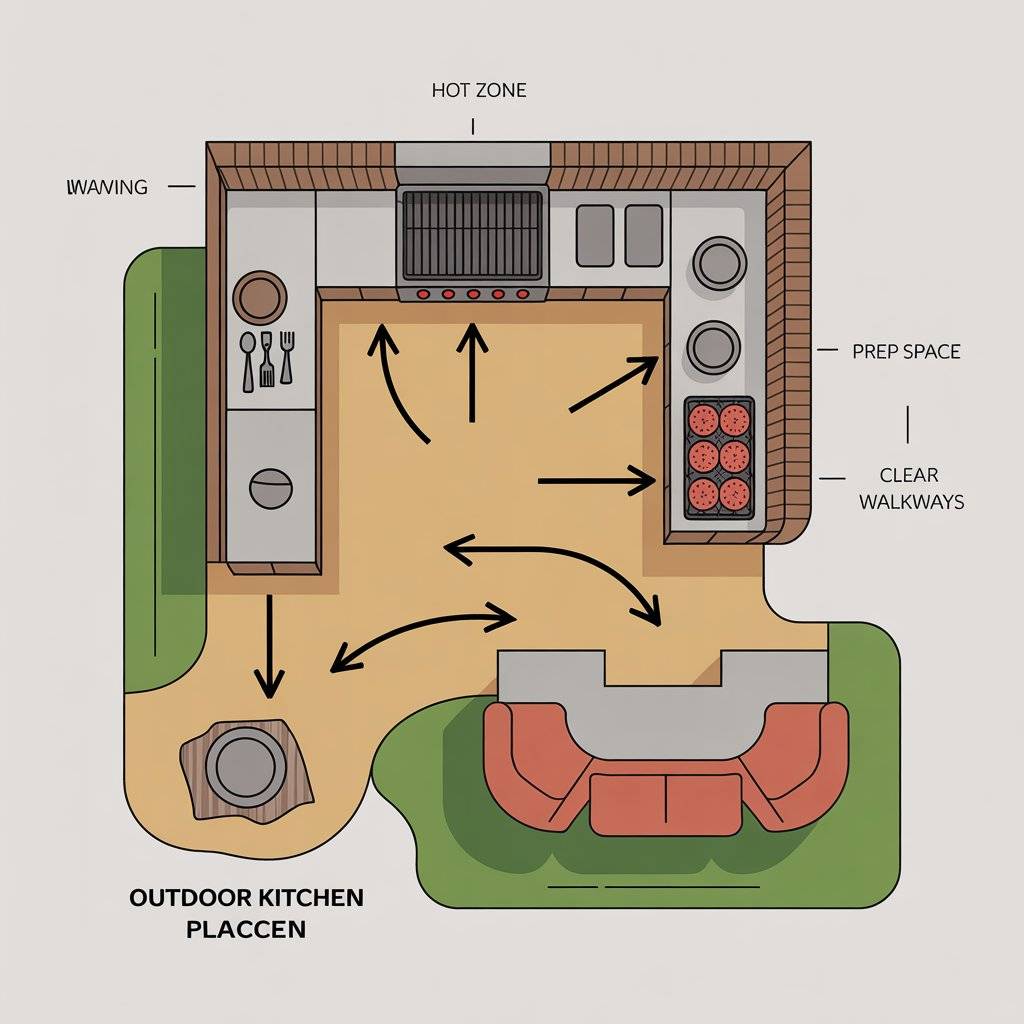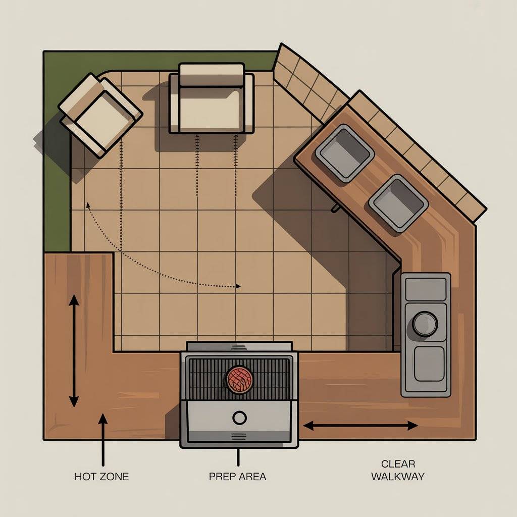 Before you buy a single appliance, think about how you’ll actually move through the space. Keep the hot zone at the edge of your cooking area so people can move behind you. Put prep space to your dominant hand and a landing shelf on the other side. Seat guests where smoke won’t drift toward them.