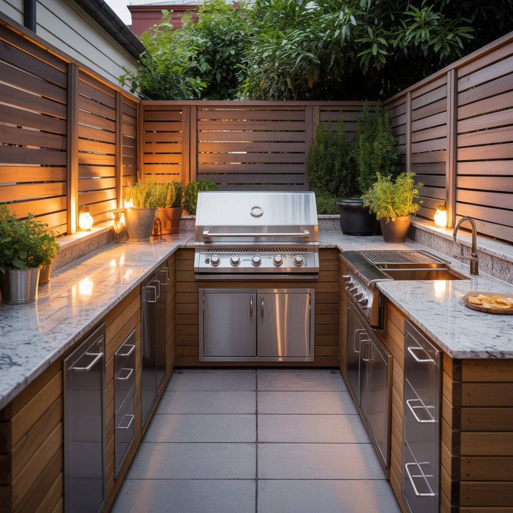 The key is keeping the footprint tight. Don’t let the L extend too far into your space. Just enough to create two functional work surfaces is all you need. L-shapes are my go-to for modest patios because they frame the space without taking over.