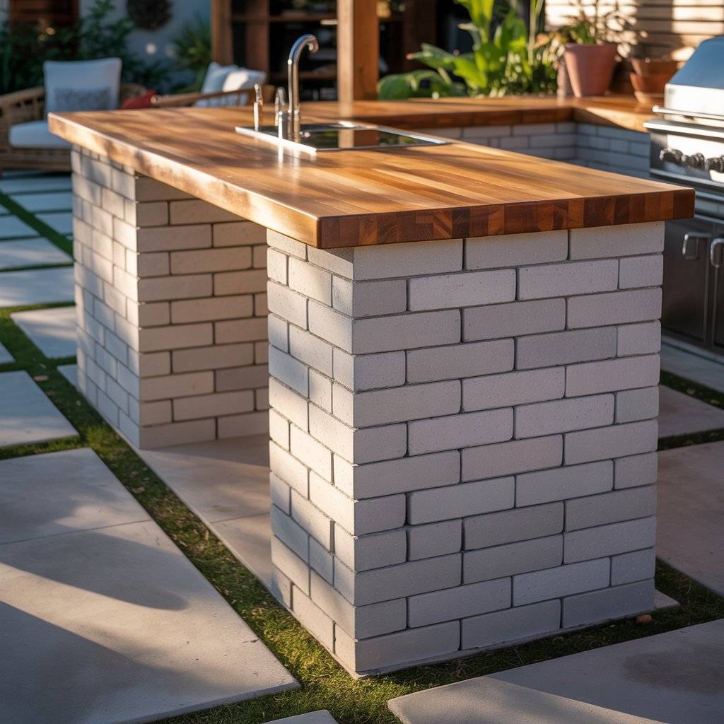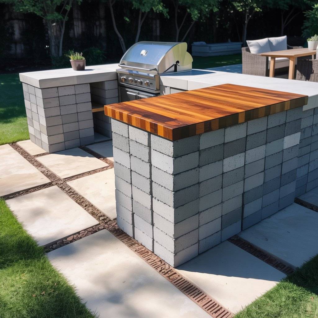 You don’t need custom cabinetry to build a sturdy outdoor kitchen. Dry-stack concrete blocks (CMUs) create a solid, fire-friendly base for a fraction of the cost. Cap them with a butcher block or tile top, and you’ve got a durable work surface that looks intentional.