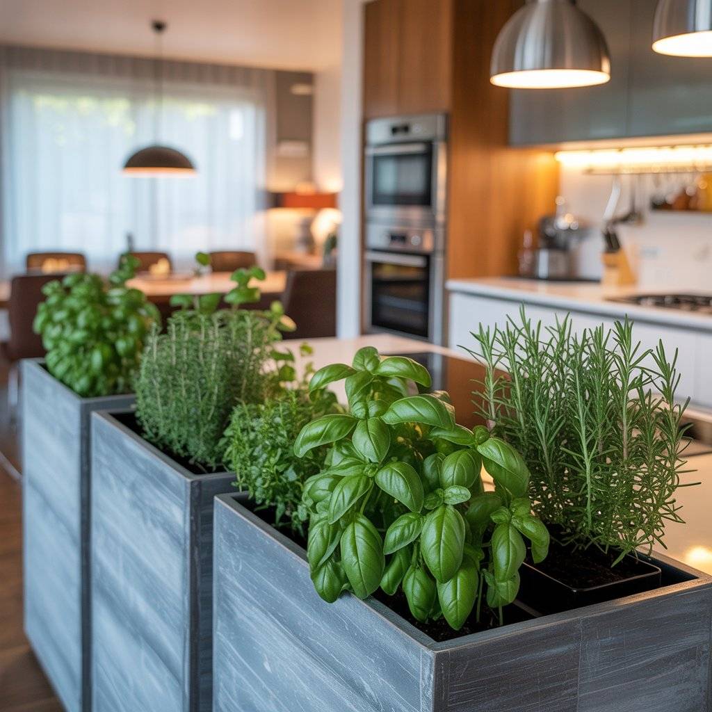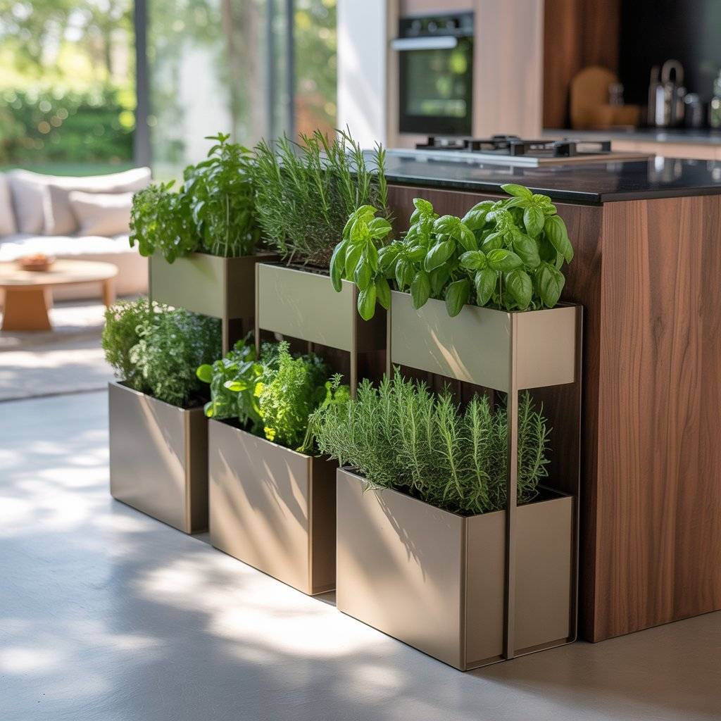 Tall planter boxes can define your kitchen area without building walls. They add privacy, soften the look of appliances, and keep herbs within arm’s reach while you cook. Bonus: fresh basil and rosemary taste way better when you snip them right before cooking.