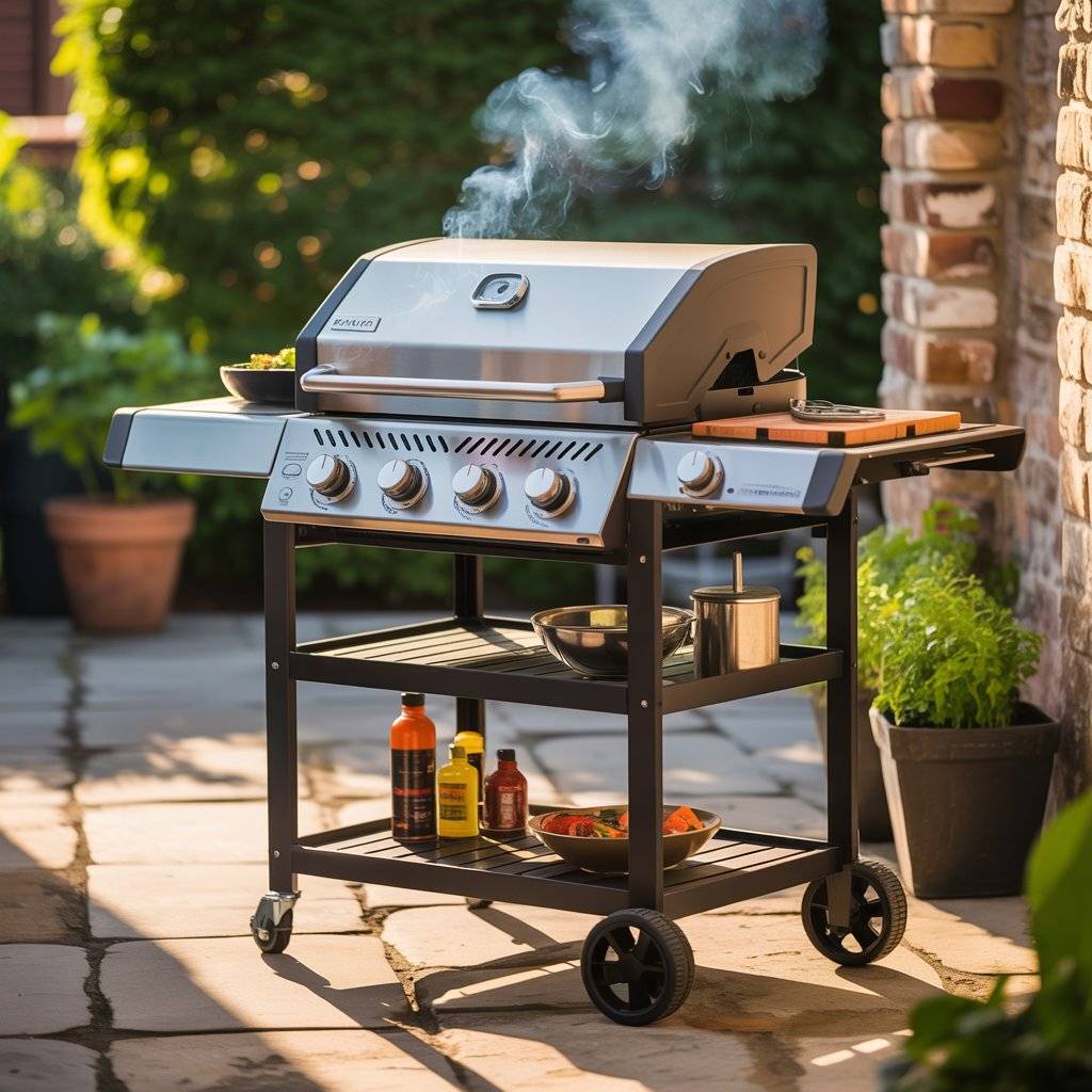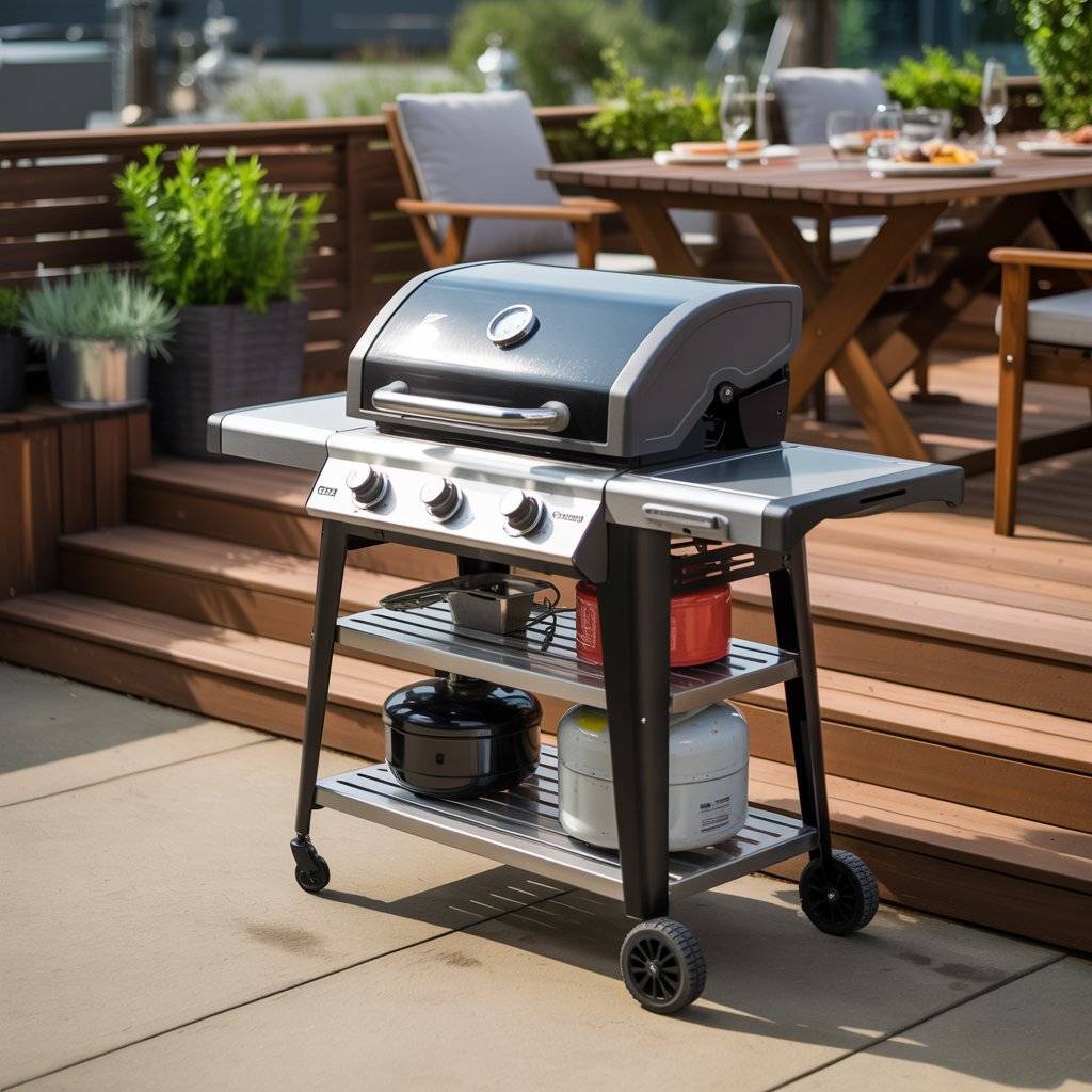 Here’s a low-commitment option that works great for renters or anyone who isn’t ready to build something permanent. A quality portable gas grill paired with an outdoor-rated rolling cart gives you counter space, storage, and flexibility. When you’re done cooking, roll it out of the way.