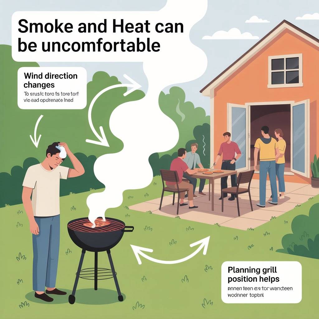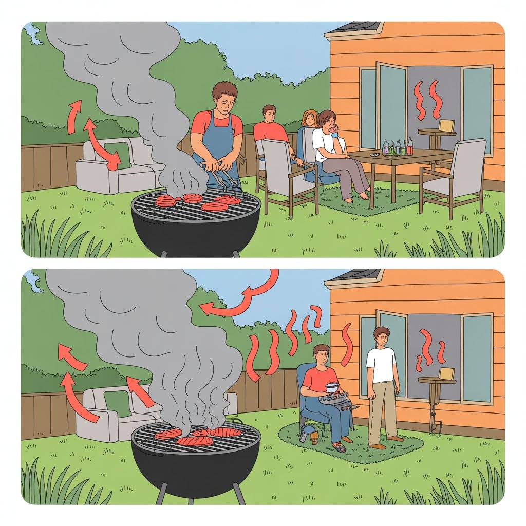 Cooking outside still produces smoke and heat, especially when grilling or using charcoal. Smoke may move toward the seating area or even enter the house through nearby doors or windows. Wind direction can change at any time, making it difficult to control where smoke goes.