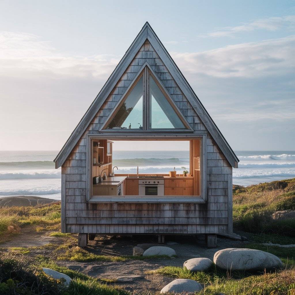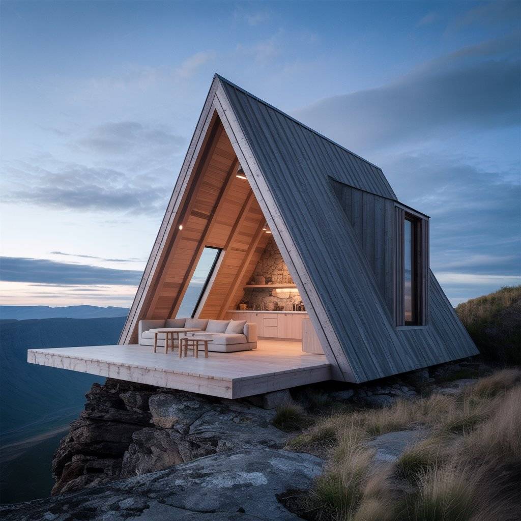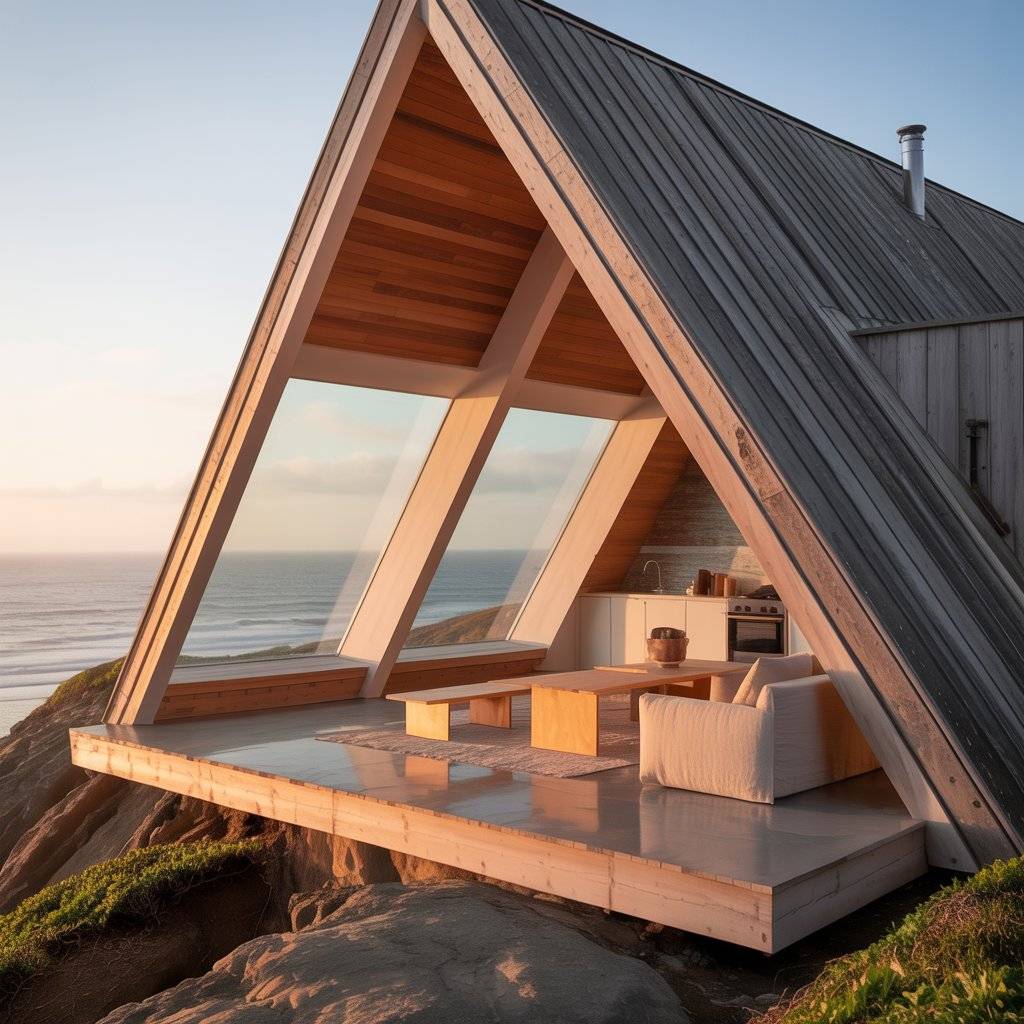A cliffside A-frame retreat needs careful planning to feel calm instead of exposed. The best designs use solid construction, limited openings, and thoughtful orientation. Windows are placed to frame the horizon, not the drop below, which helps the space feel steady.