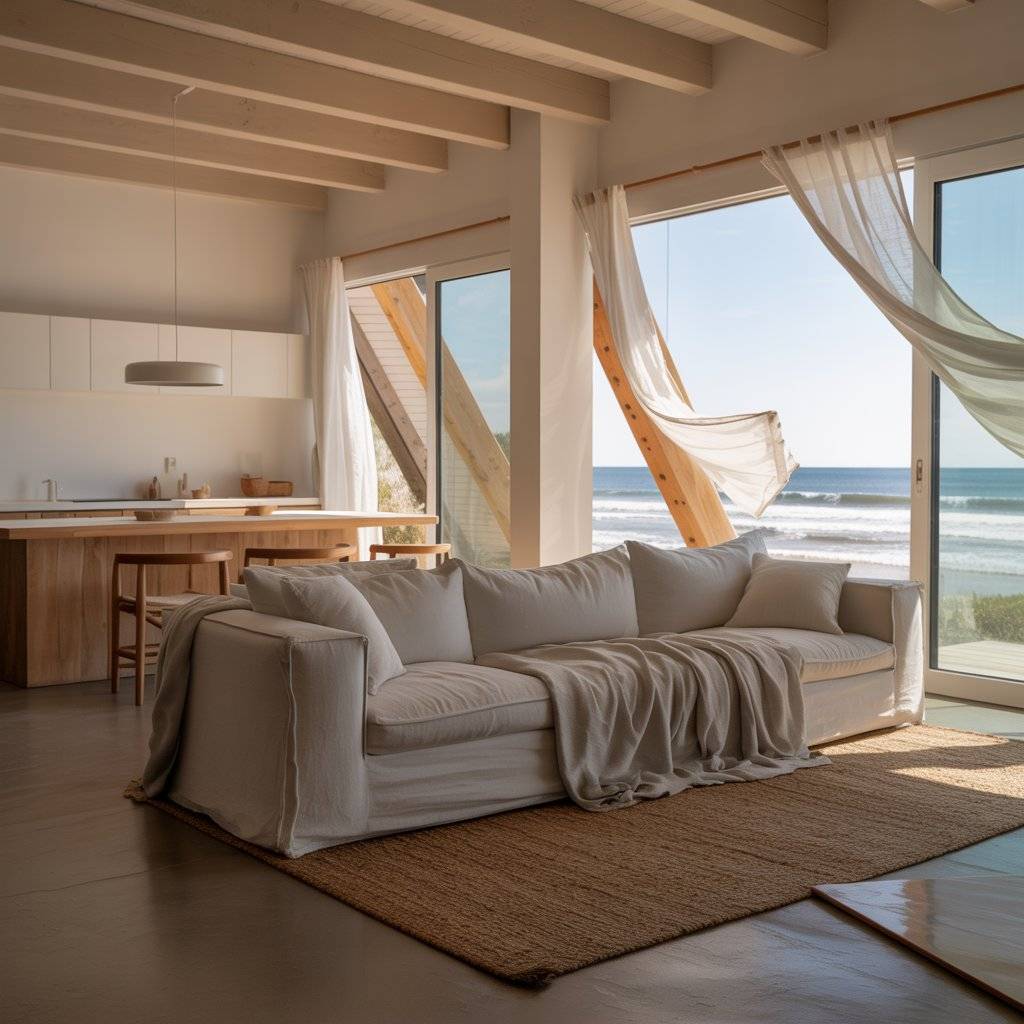 Windows are positioned to catch changing light and wind. Curtains move gently throughout the day. Furniture stays simple and sturdy, often made from natural wood. The kitchen is practical, designed for easy meals after long walks outside.