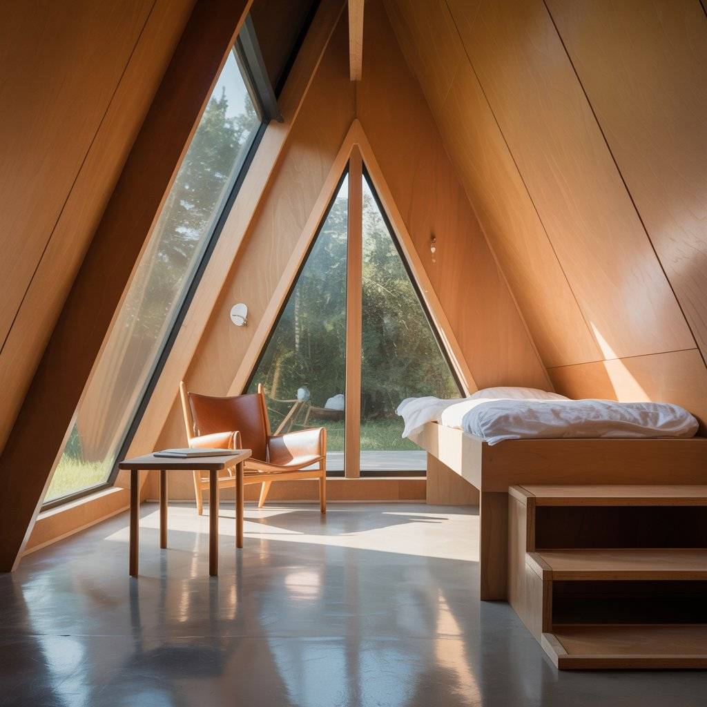 Some A-frame sanctuaries are built for one person, and those are often the quietest. These compact designs remove everything that isn’t necessary. One chair, one table one bed. That’s it.