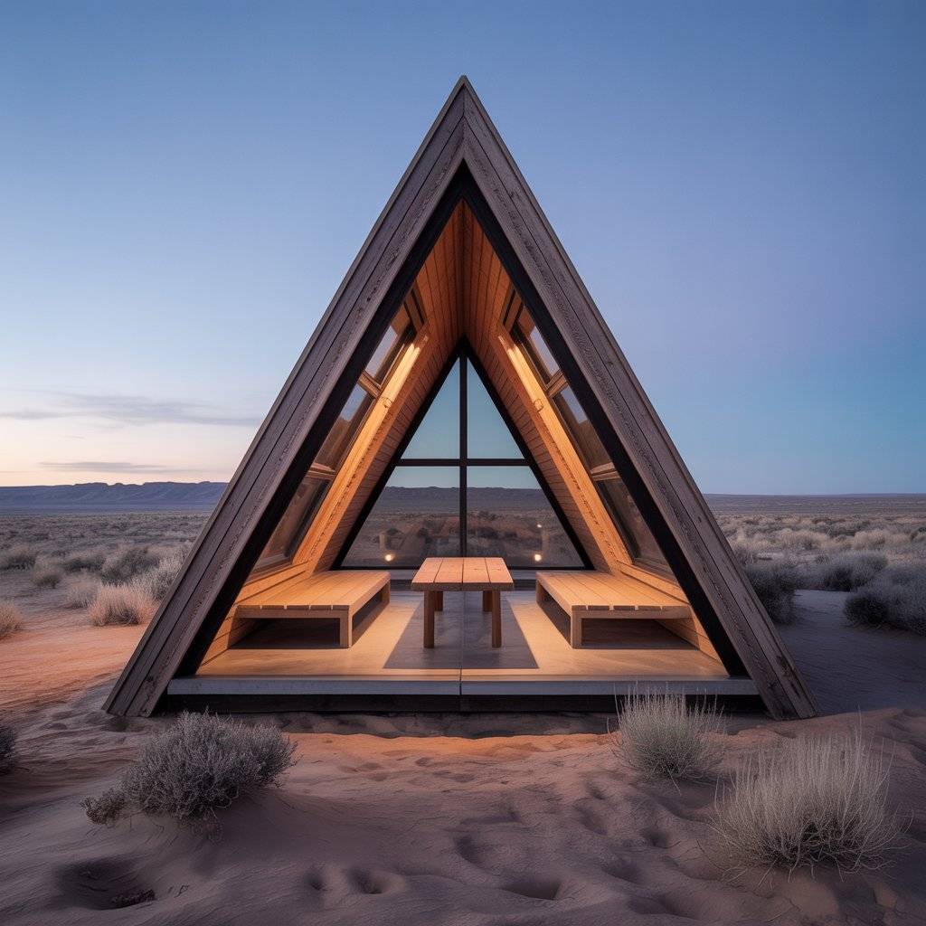A desert A-frame retreat works best when it leans into the quiet of its surroundings instead of trying to soften it. These homes often use raw materials unfinished wood, concrete floors, and simple metal fixtures. The structure itself provides shade and protection from heat, while narrow windows are placed carefully to let in light without overwhelming the space.