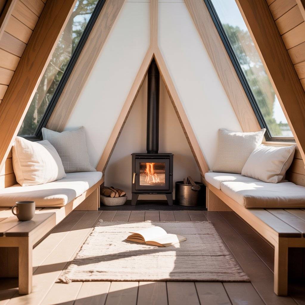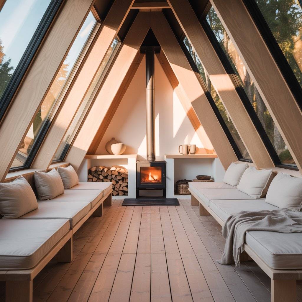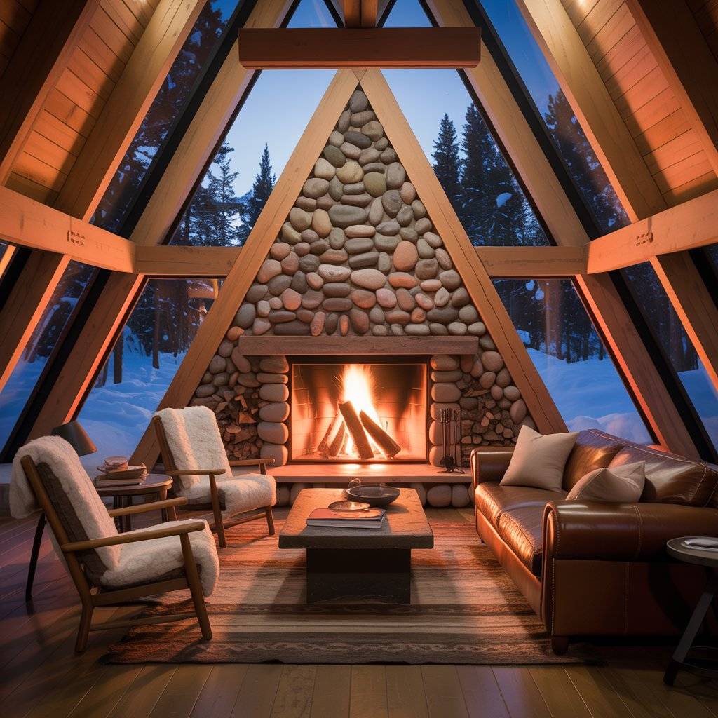 Some A-frame sanctuaries place the fireplace at the center of the design. Everything else is arranged around it. This creates a natural gathering point without noise.