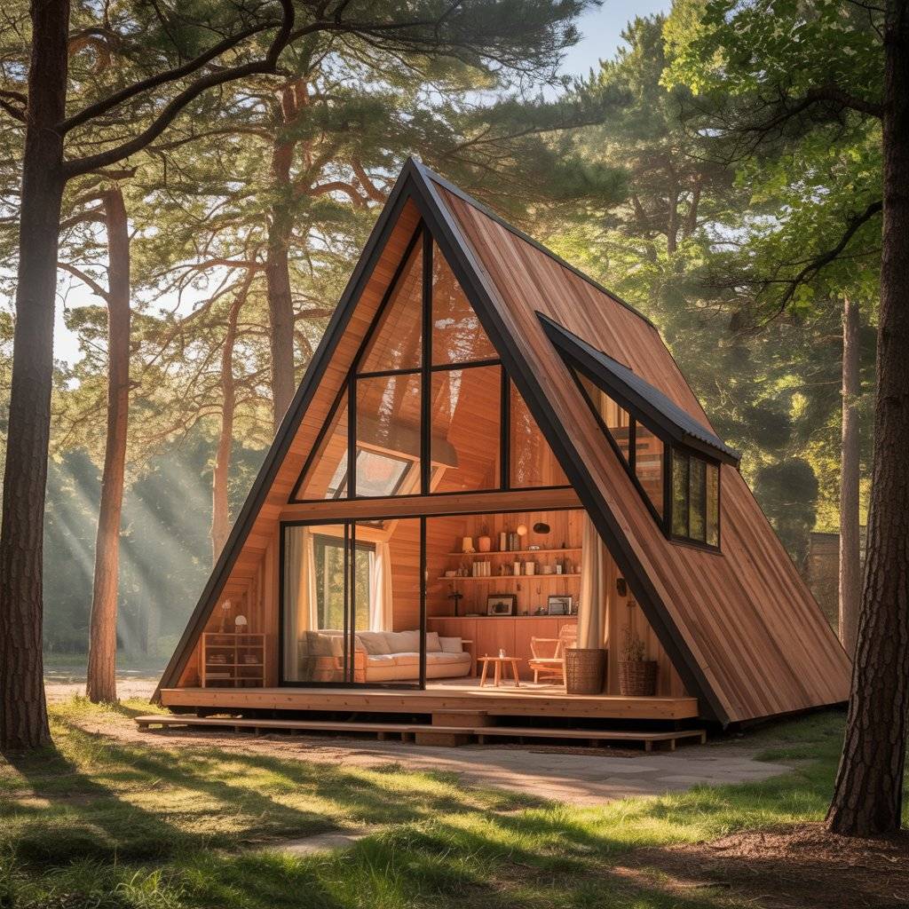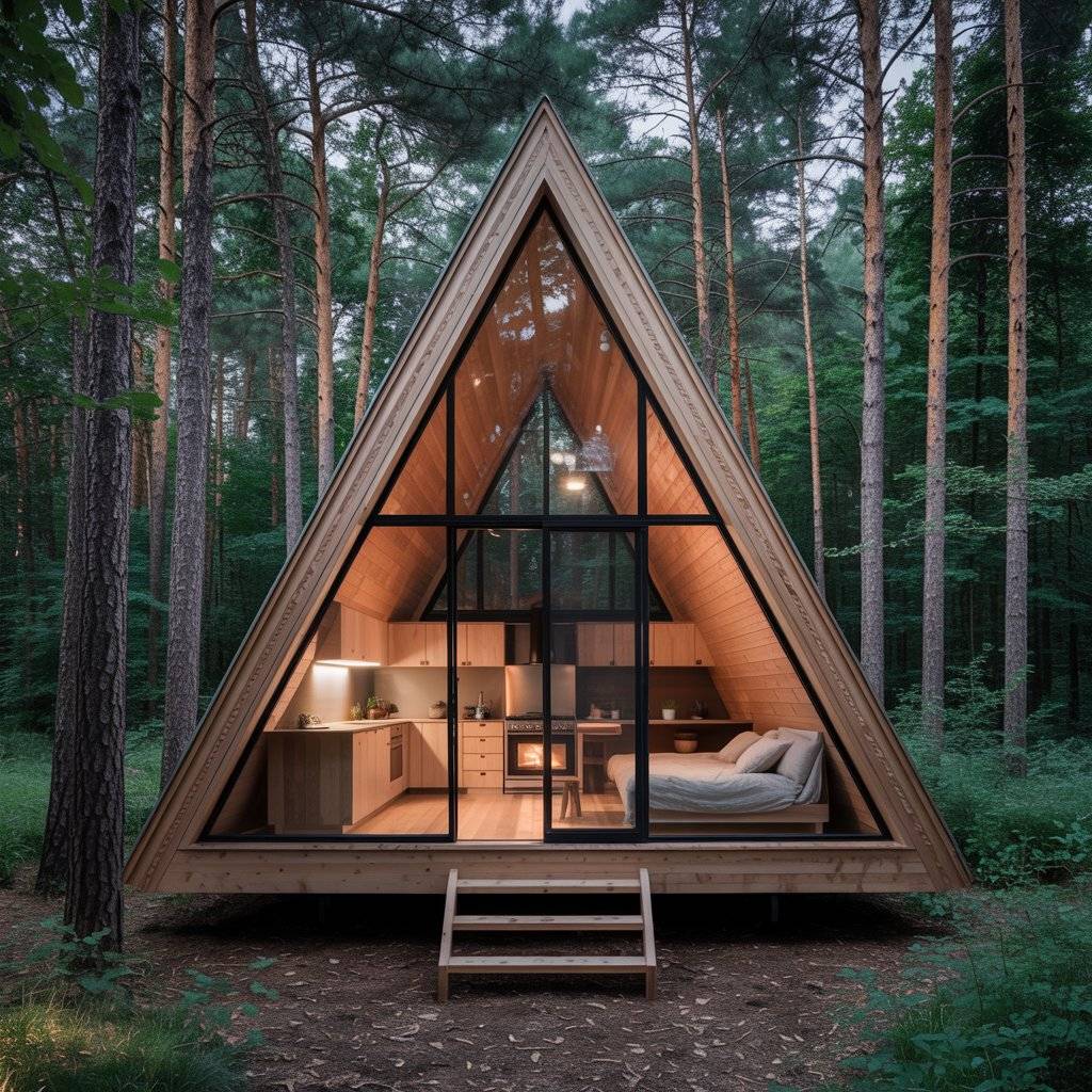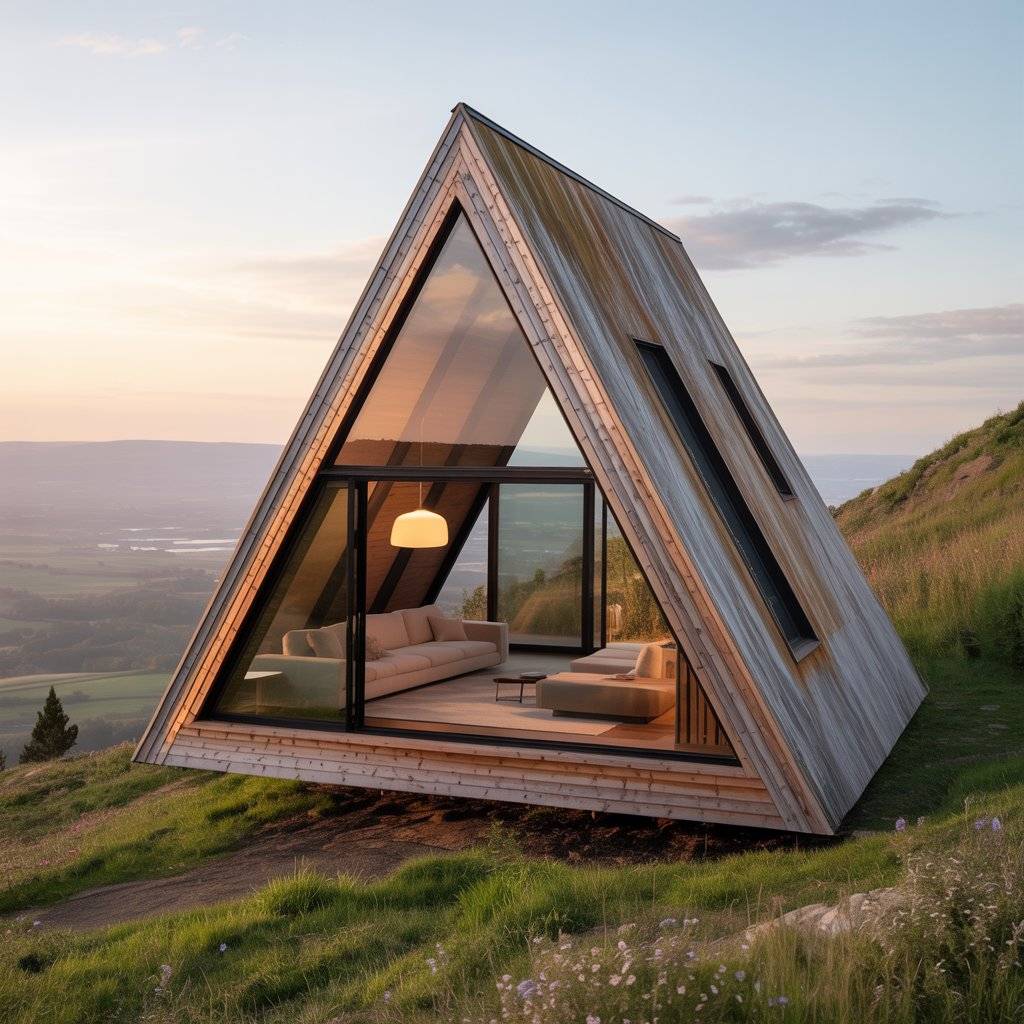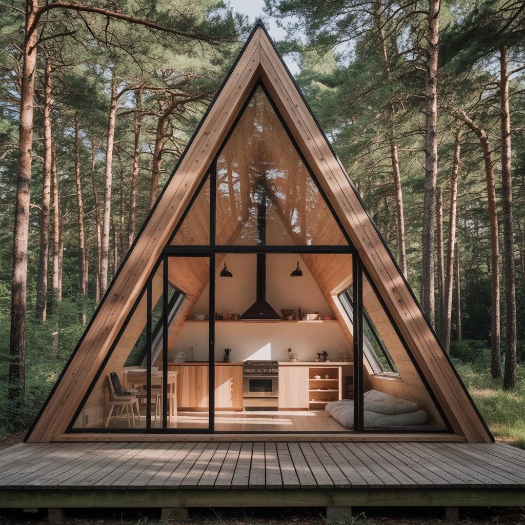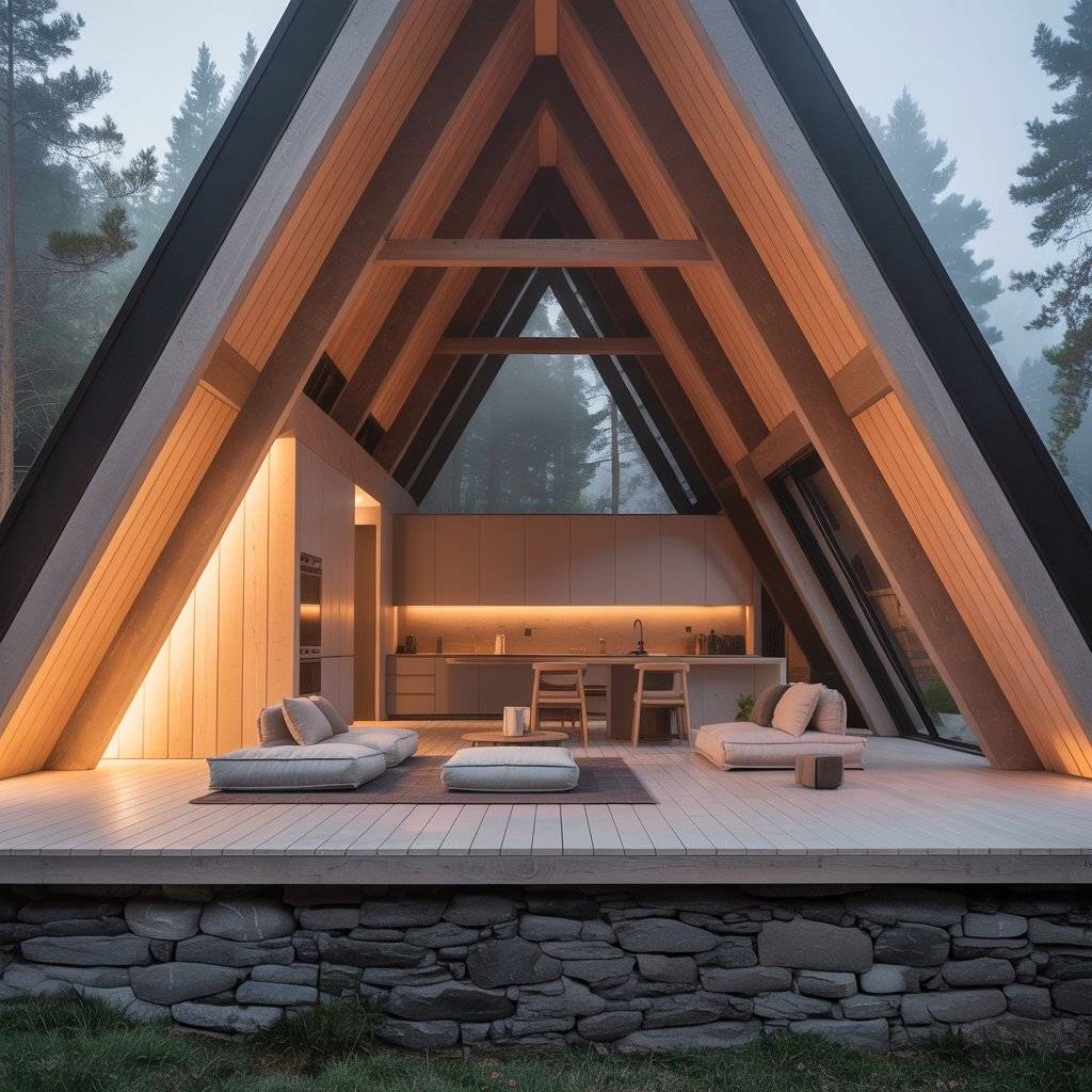A-frame retreats built on narrow plots often surprise people. When designed well, they feel private and spacious despite limited width. The steep roof allows vertical space to do the work.
