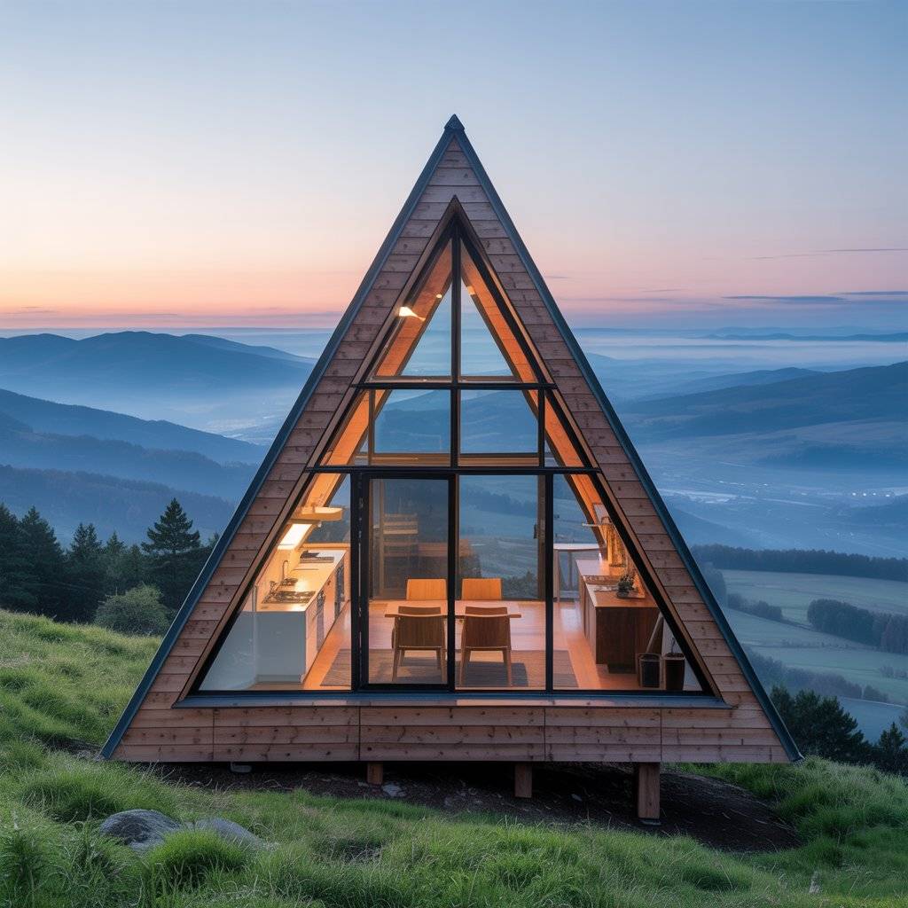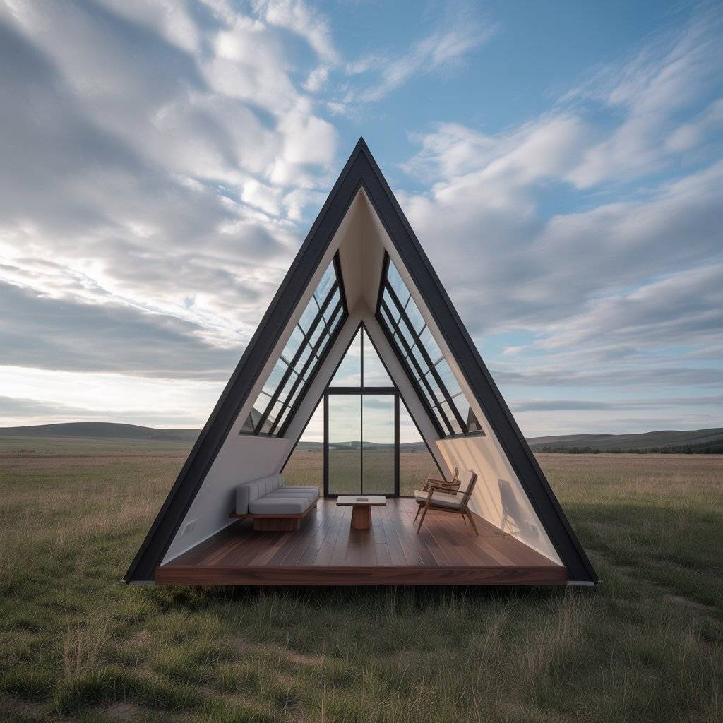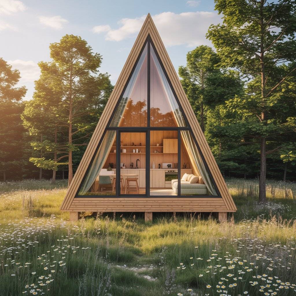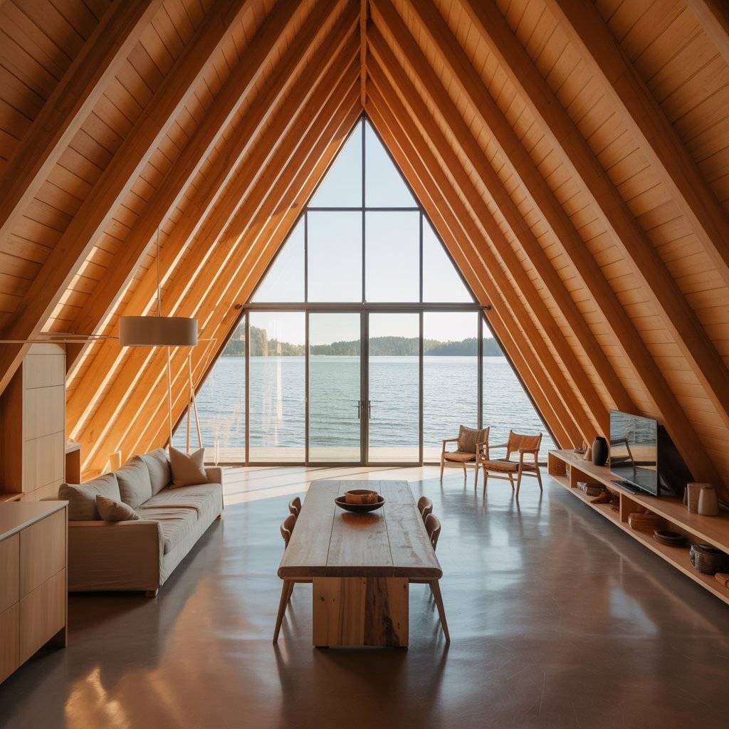 A-frame retreats built on narrow plots often surprise people. When designed well, they feel private and spacious despite limited width. The steep roof allows vertical space to do the work.