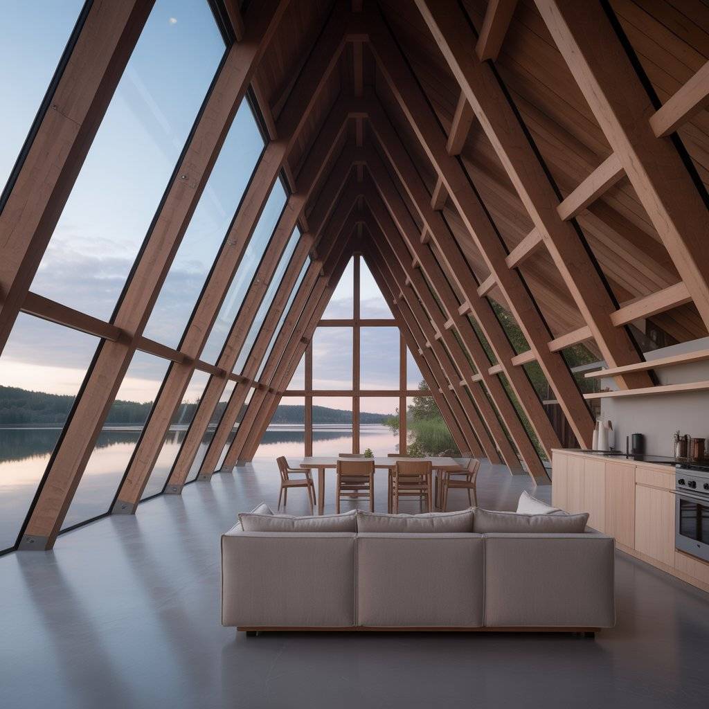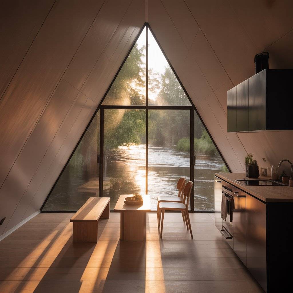 A river bend A-frame retreat feels different throughout the day. Light moves slowly across the water and reflects into the interior. Good designs take advantage of this by keeping walls simple and surfaces matte, so light feels soft instead of harsh.