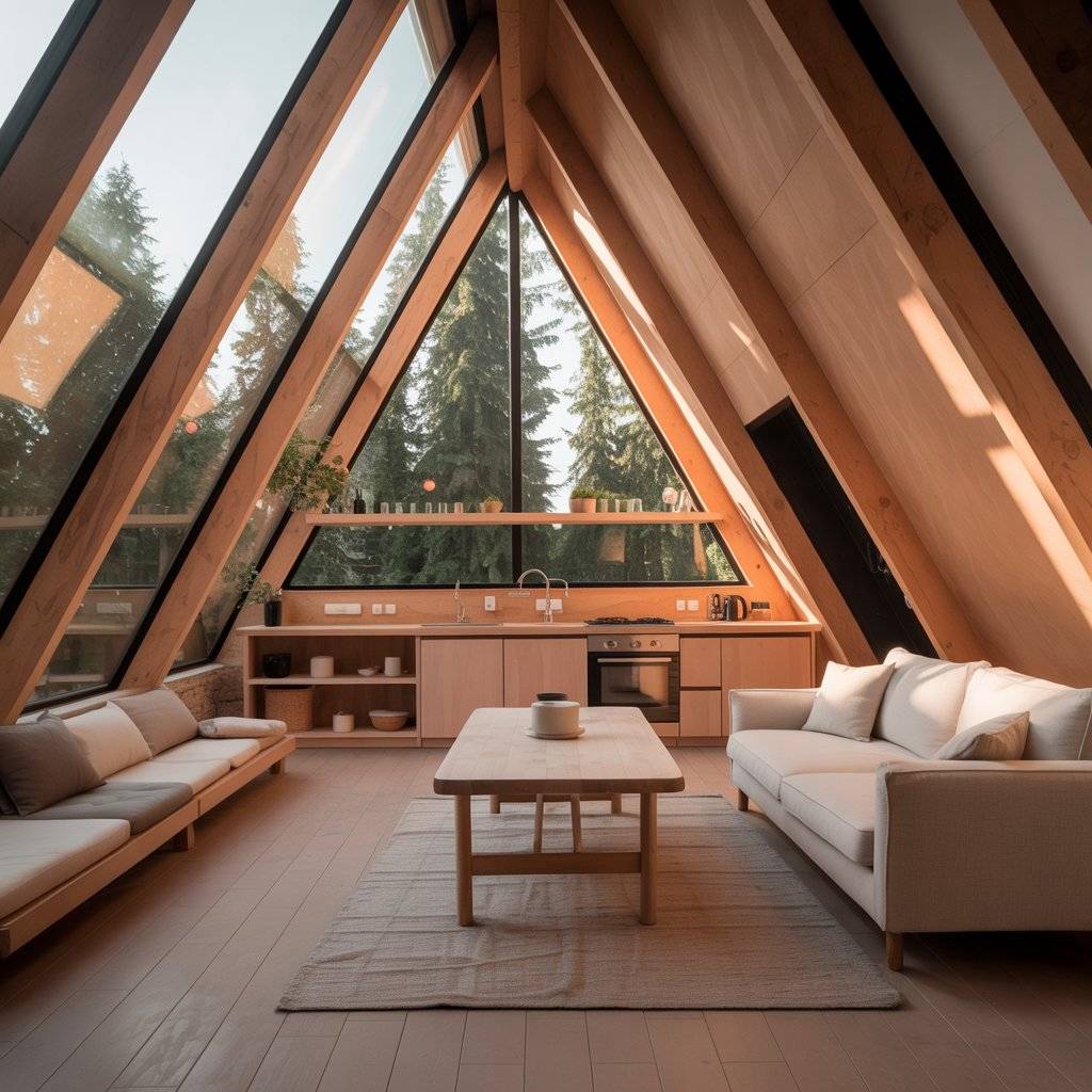 Scandinavian-style A-frame sanctuaries focus on warmth and balance. The structure is sharp and clean, but the interior feels soft. Light wood floors, white walls, and simple textiles keep the space bright without feeling cold. Natural light plays a big role here, especially during long mornings.