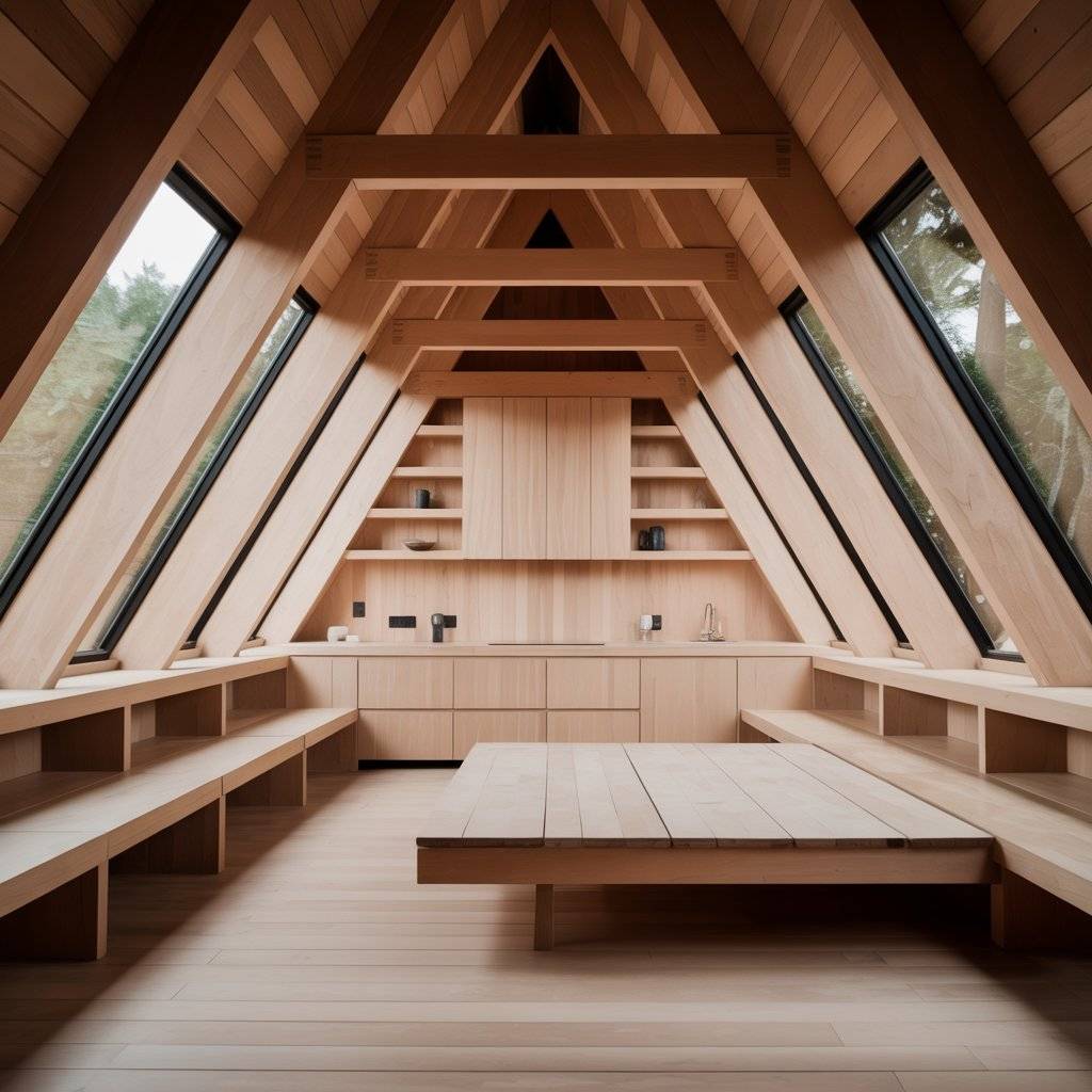 Some of the calmest A-frame sanctuaries rely heavily on built-in furniture. Benches, beds, and shelves are designed as part of the structure. This reduces visual noise and keeps the space clean.