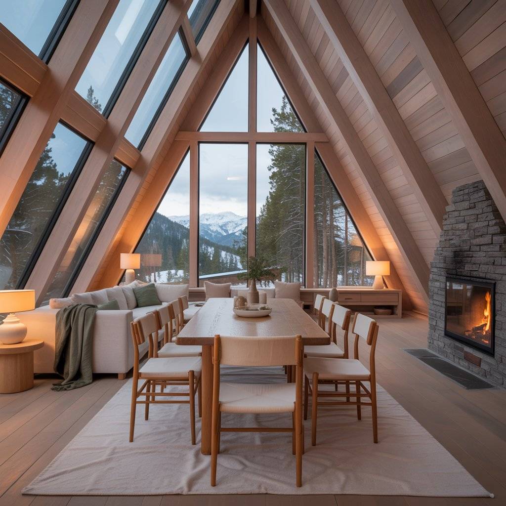 A mountain A-frame retreat benefits from keeping the interior calm and neutral. I’ve seen spaces where soft wood tones, light fabrics, and muted colors make the tall structure feel grounded instead of dramatic. The steep ceiling draws your eyes up, but the neutral palette brings everything back down.