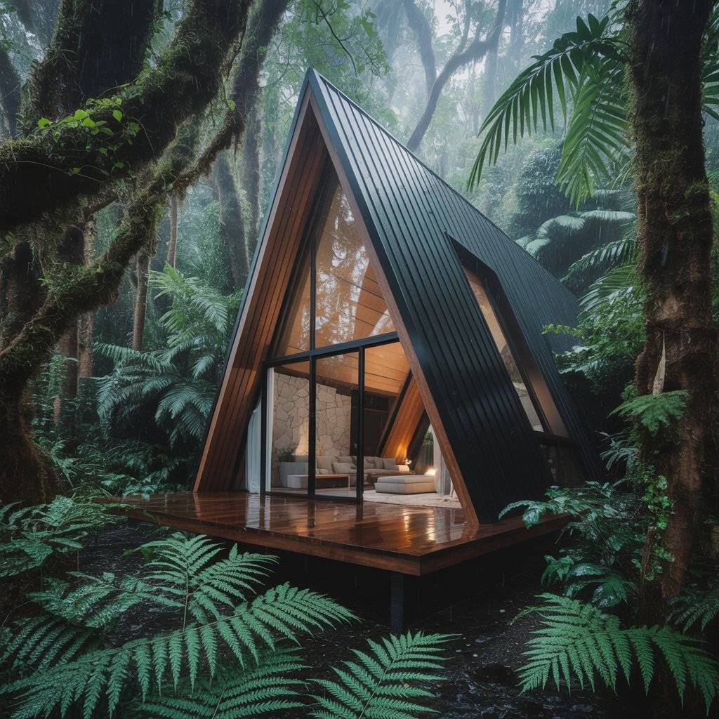 Rainforest A-frame retreats benefit from working with moisture, sound, and shade. Rooflines are steep for rain runoff. Overhangs protect windows. Interiors stay dry and calm.