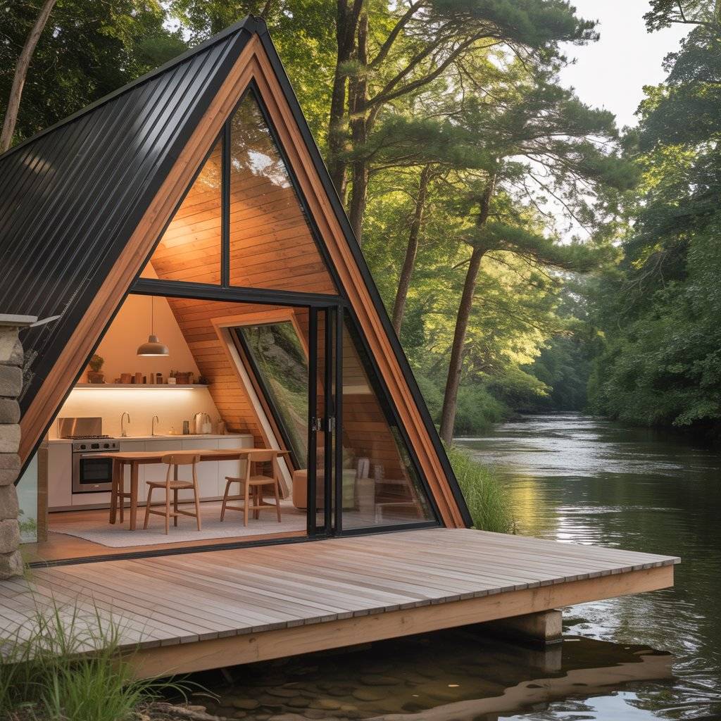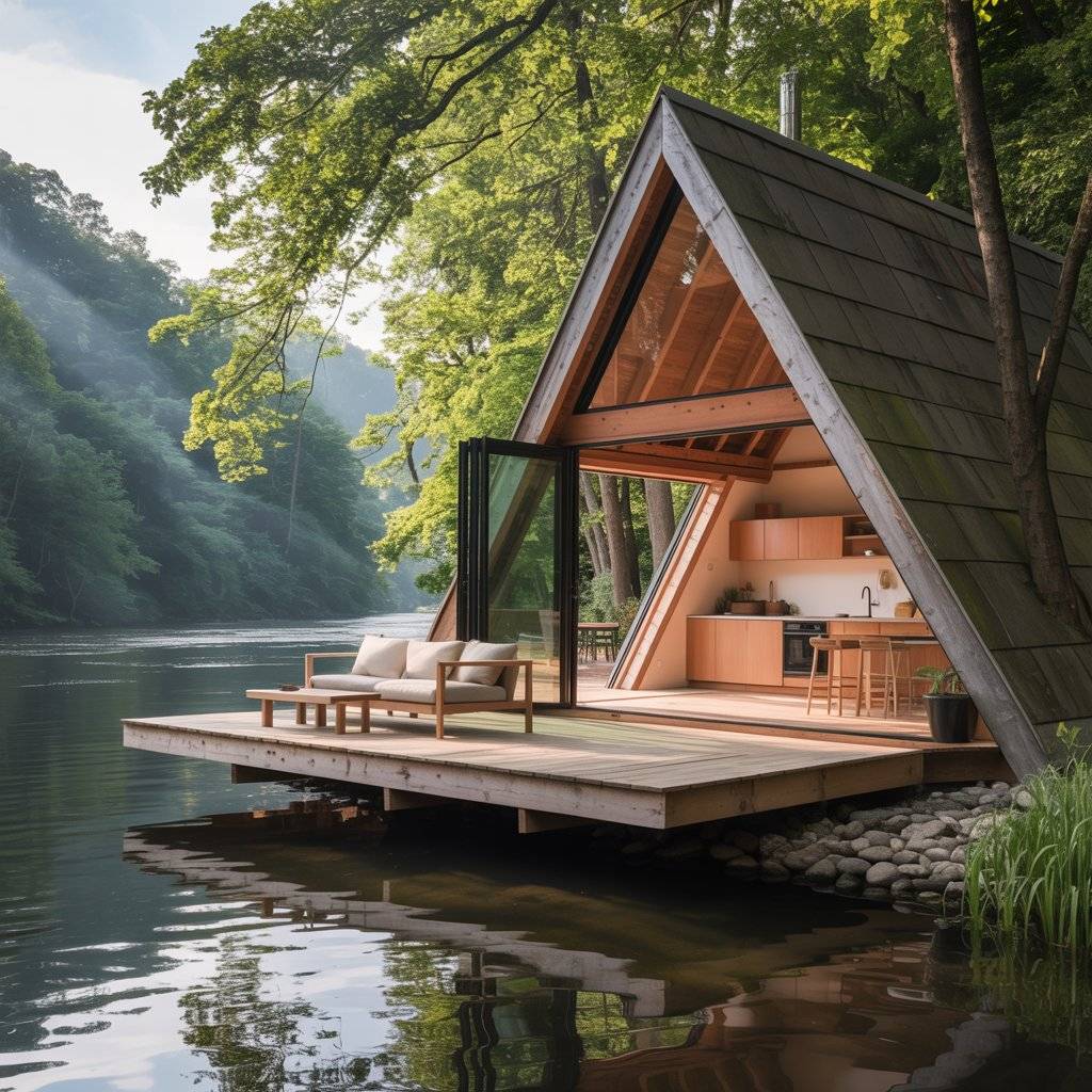 A riverfront A-frame sanctuary benefits from staying connected to the water. Large doors or windows often open directly onto a deck, making it easy to move outside without thinking about it. The interior stays simple so the sound of the river becomes part of the space.