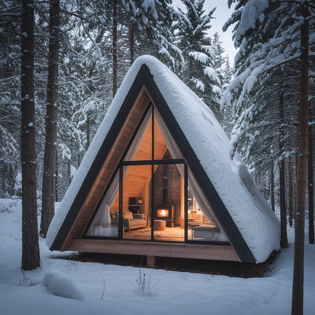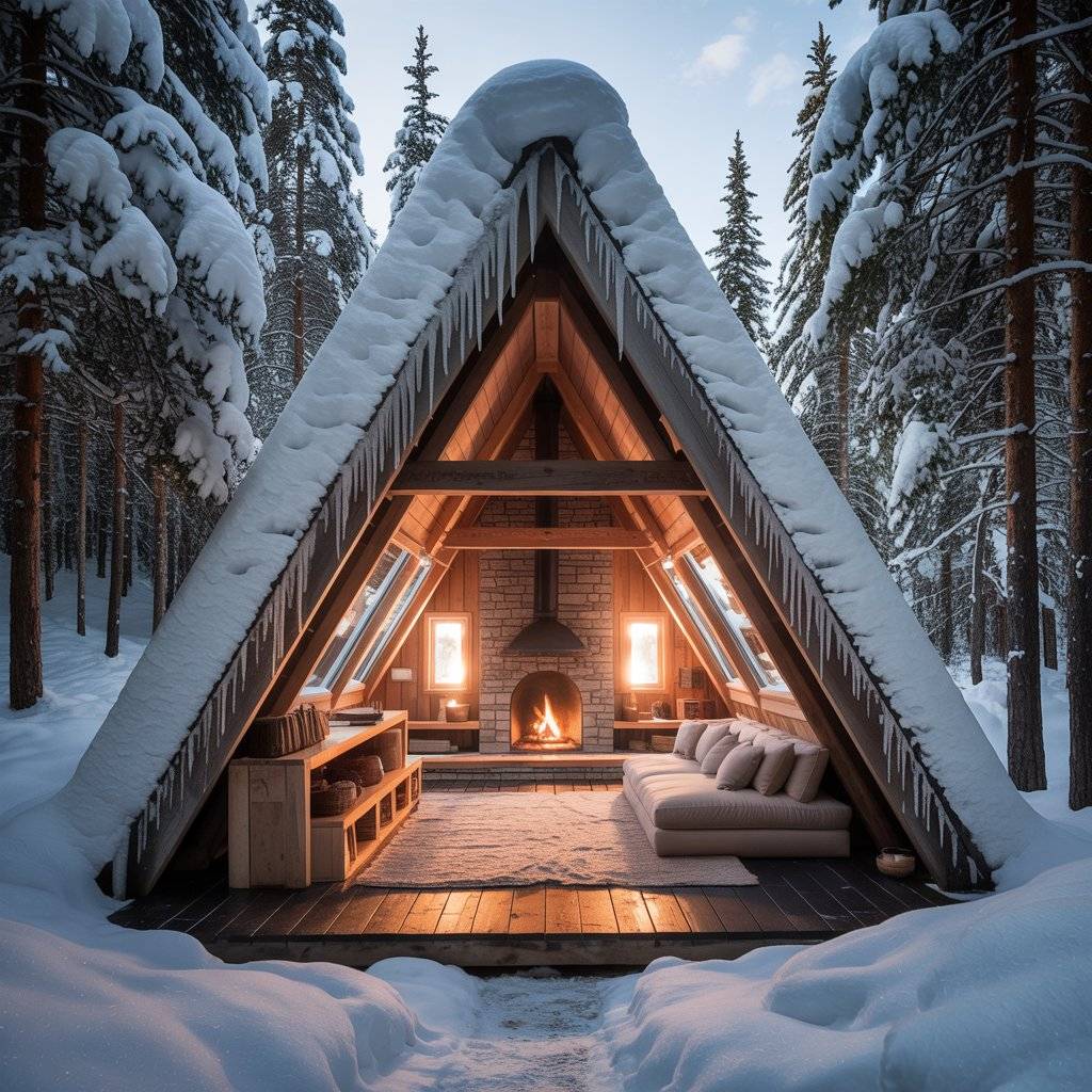 A snowy woodland A-frame retreat feels different from any other. Sound is muted. Light is softer. The design needs to support that calm rather than fight it. These homes usually rely on strong insulation, a wood stove, and simple layouts that keep heat where it’s needed.