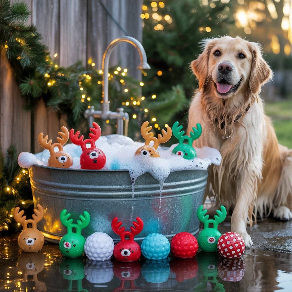 Sometimes pets are anxious about baths. I keep a few waterproof, durable toys in the wash area to distract and entertain them. For Christmas, I choose seasonal toys like floating reindeer or snowball-shaped chew toys.