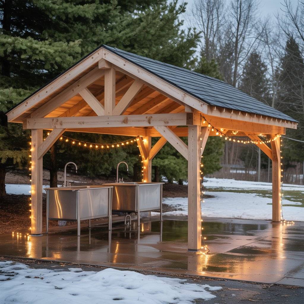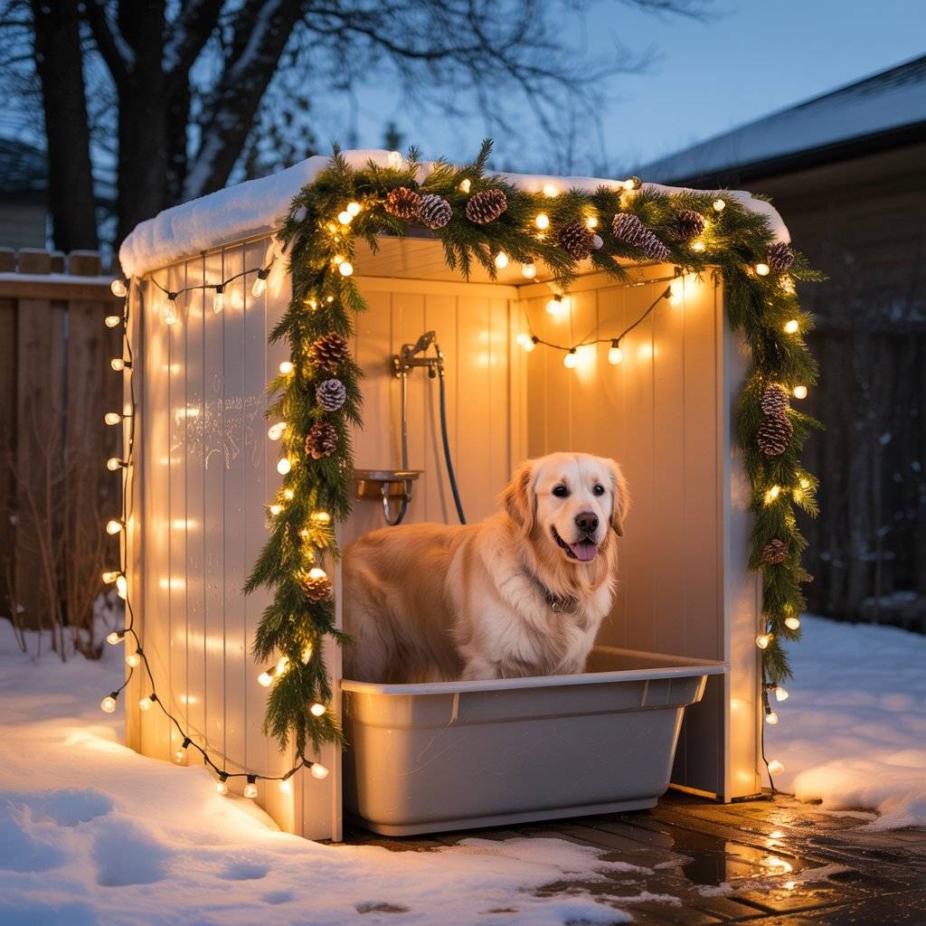 For Christmas, I hang subtle waterproof garlands or string a few LED lights along the shelter’s edges. It creates a cozy, festive atmosphere without interfering with washing or drying. A proper shelter keeps pets safe and comfortable, and it makes the entire backyard wash station feel like a thoughtful, luxury space ready for winter and holiday celebrations.