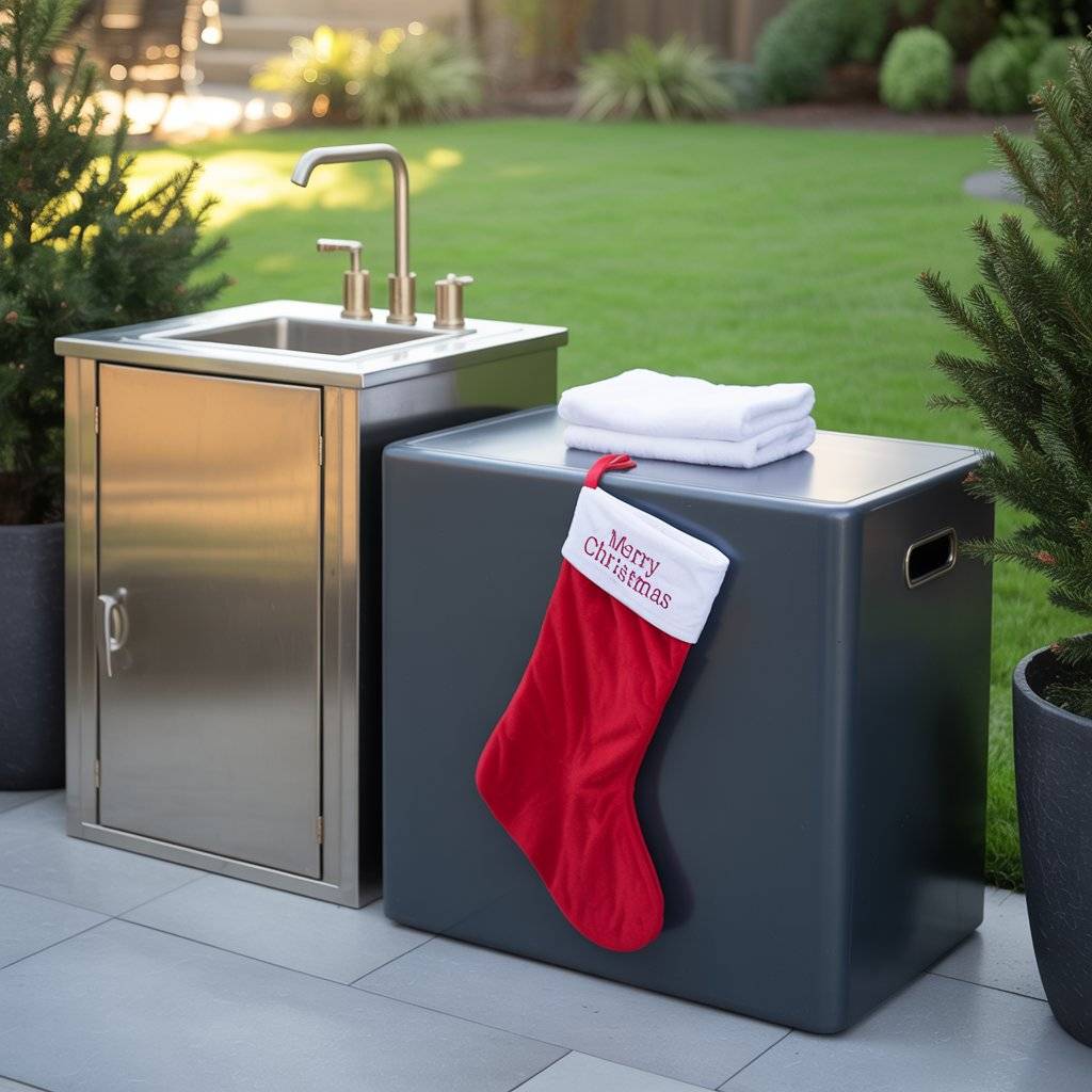 This makes cleanup easier, keeps the station organized, and adds holiday charm. Having a large bin keeps all essentials in one place, reduces clutter, and helps the backyard wash station feel intentional, modern, and luxury-ready.