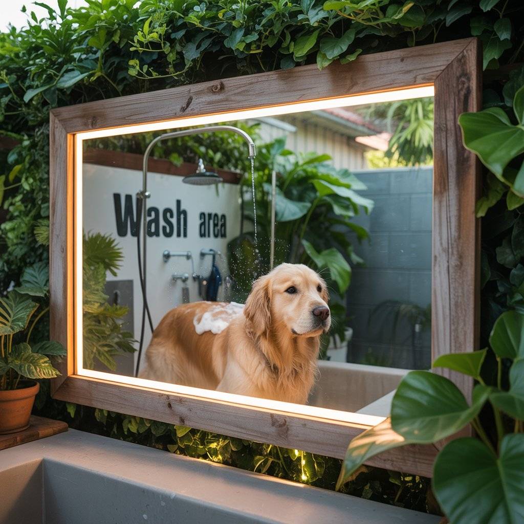 I installed a wide outdoor-safe mirror near the wash area so I can see pets from different angles while grooming. It’s surprisingly helpful for making sure shampoo is fully rinsed or fur is brushed evenly.