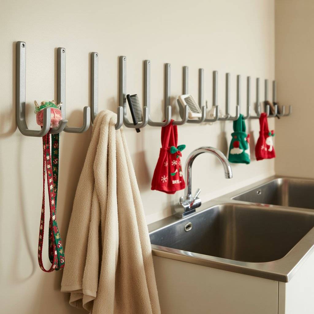 I mounted a row of wide, sturdy hooks near the wash station to hang towels, leashes, and brushes. Everything is within reach, and pets can’t knock things over while being washed.