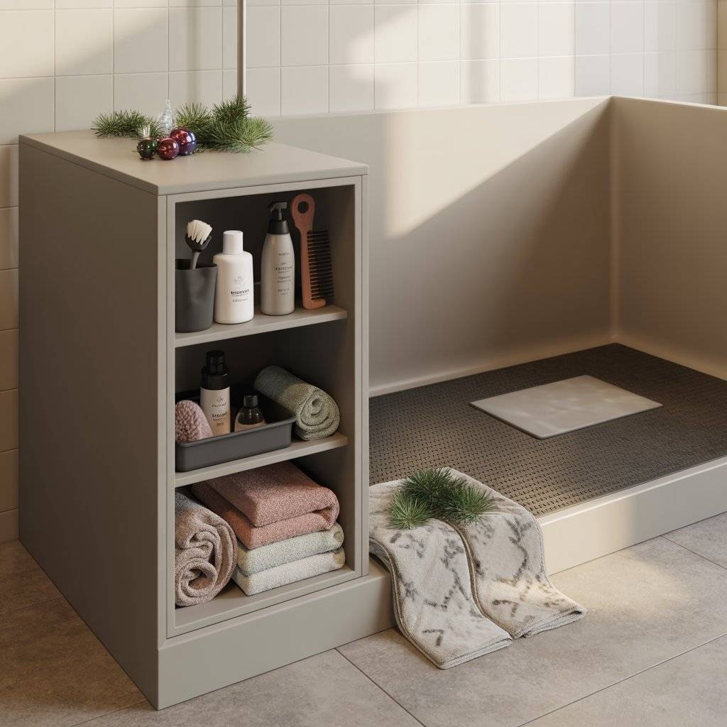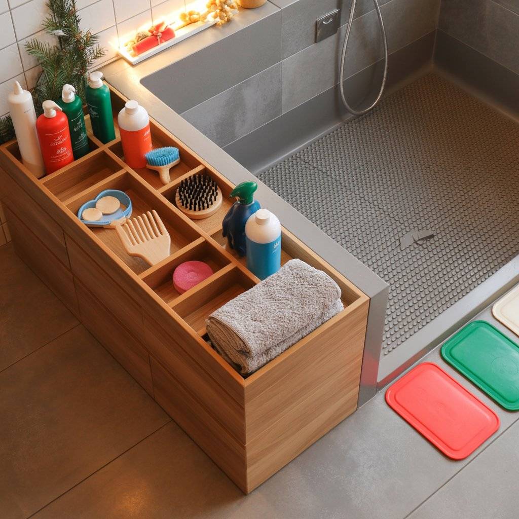 Around Christmas, I place a couple of waterproof mats with holiday colors nearby and keep fluffy towels on hand. A strong, wide platform makes the whole wash easier, safer, and more enjoyable, and it also gives the station a clean, polished look.