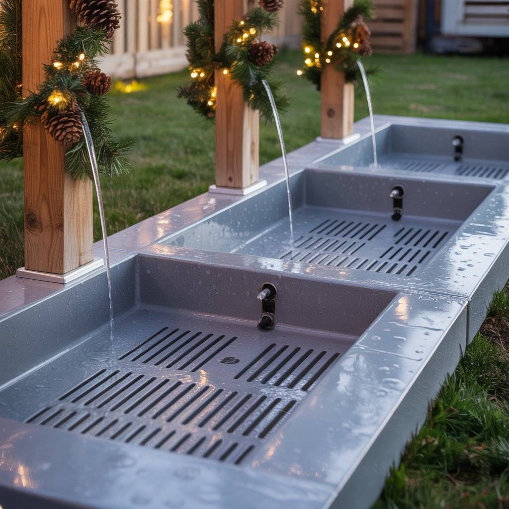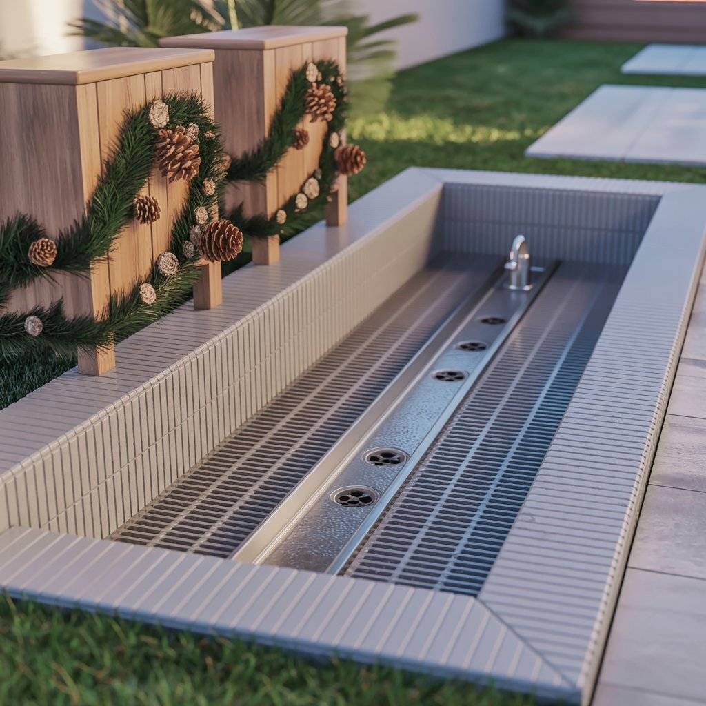 During Christmas, I decorate nearby posts with waterproof garlands or pinecones. A wide rinse area keeps pets safe, makes cleanup simple, and gives the backyard a modern, finished look for the holidays.