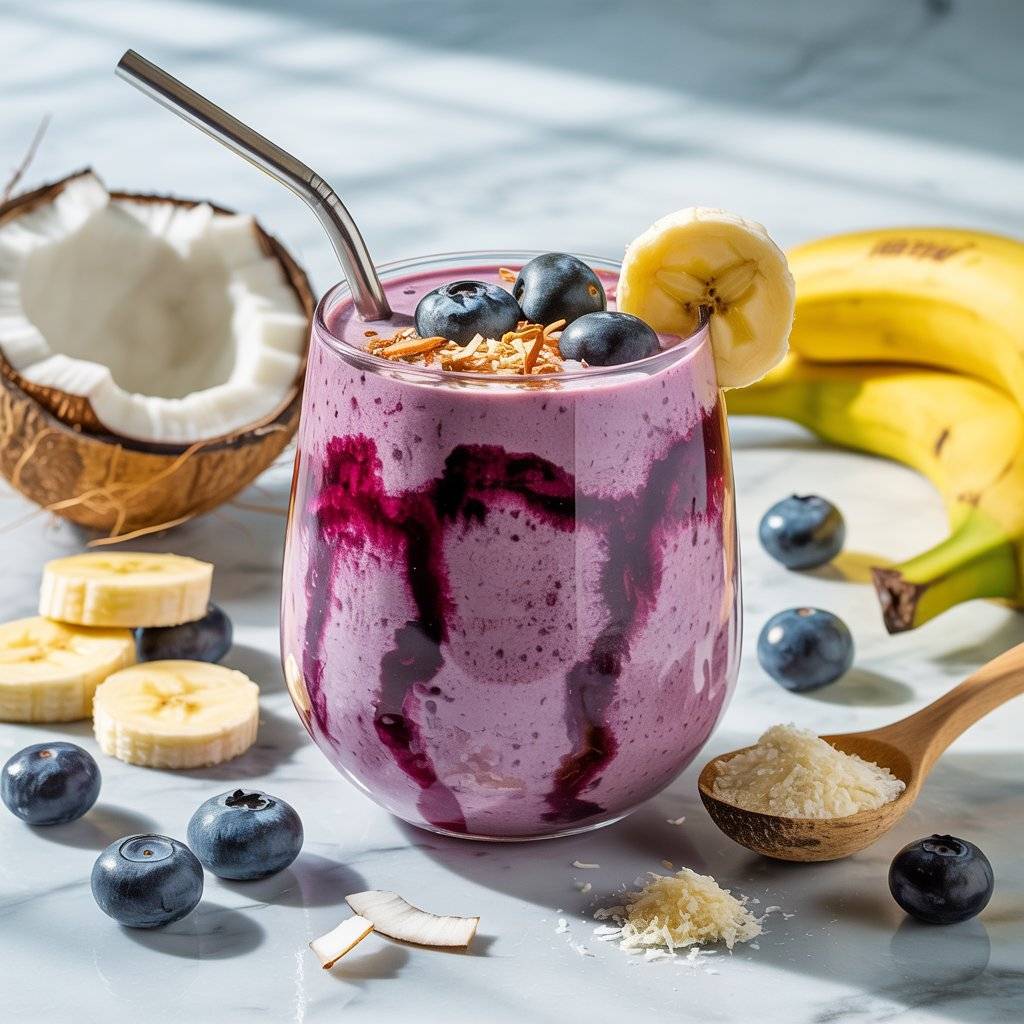 Blueberries support brain health and reduce inflammation, while coconut provides healthy fats for sustained energy. Optional: add a teaspoon of maca powder to enhance stamina and hormonal balance.