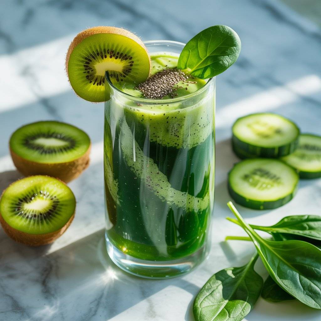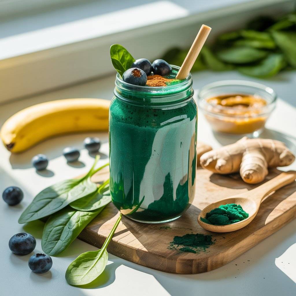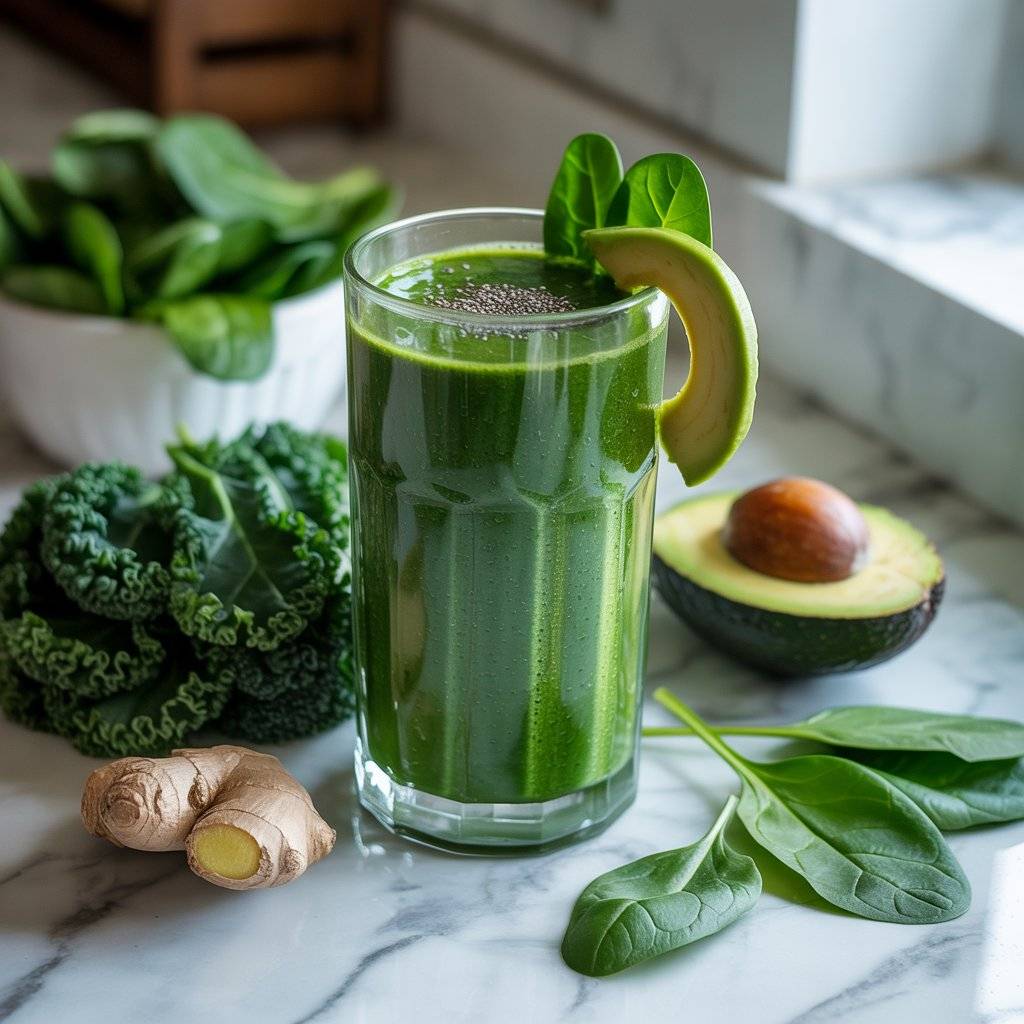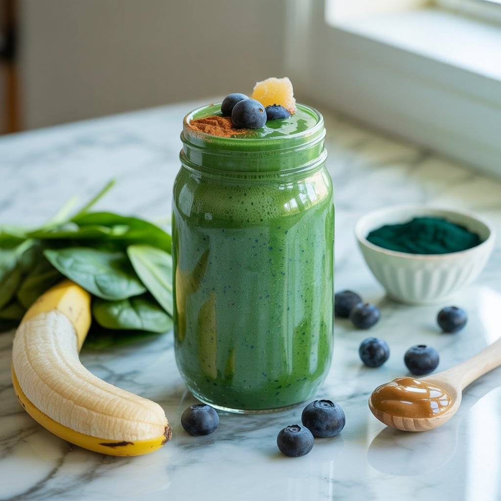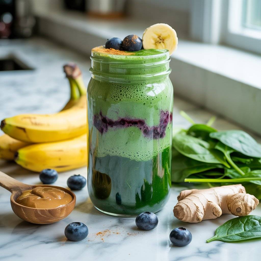 Add a scoop of plant-based protein and a splash of almond milk for a creamy texture. A hint of ginger boosts digestion, while chia seeds provide omega-3s for mental clarity. Perfect for a mid-morning pick-me-up without caffeine crashes.