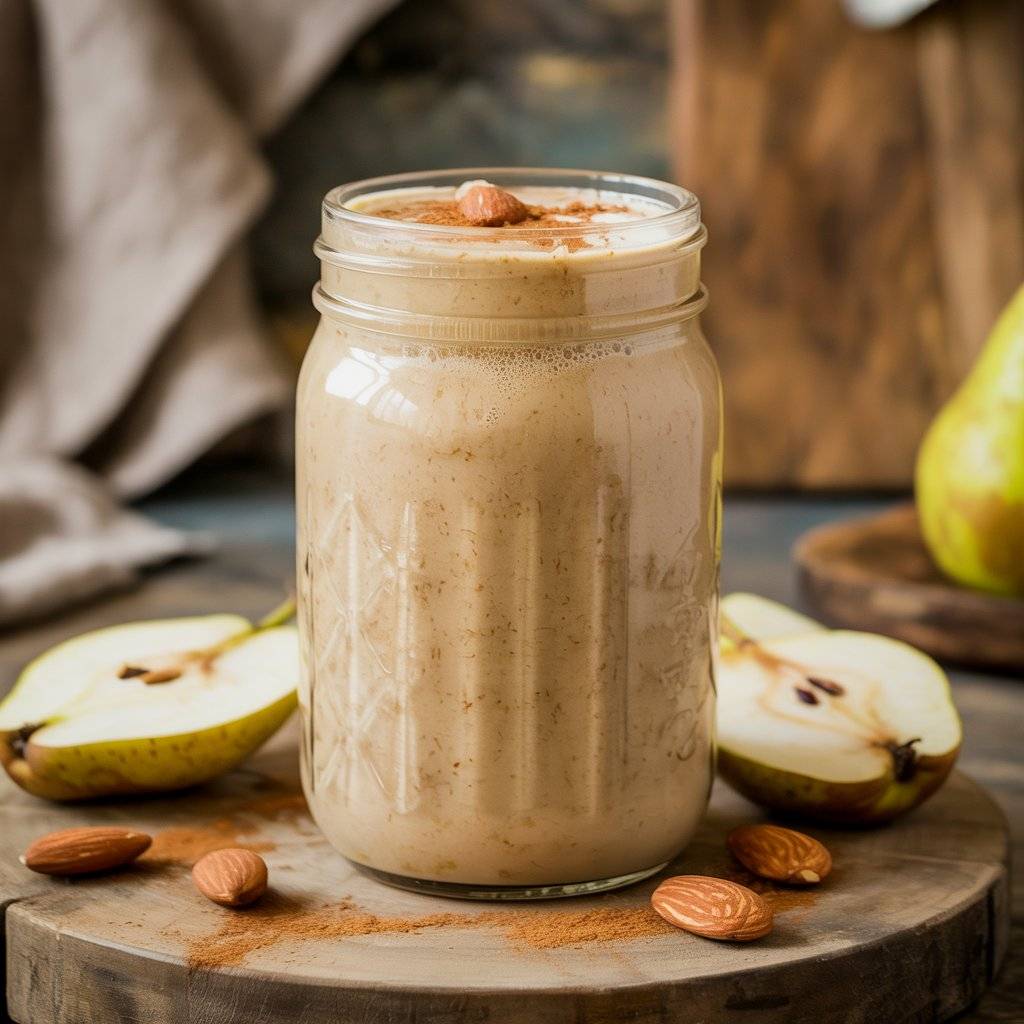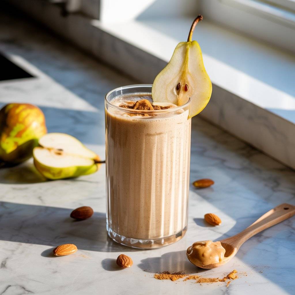 Pear, almond butter, and a touch of cinnamon create a subtly sweet and filling smoothie. Pear adds fiber and natural sugars for steady energy, while almond butter brings protein and healthy fats.