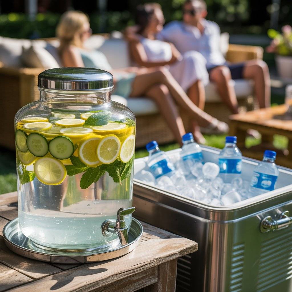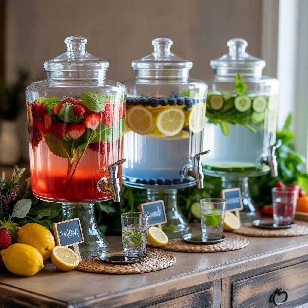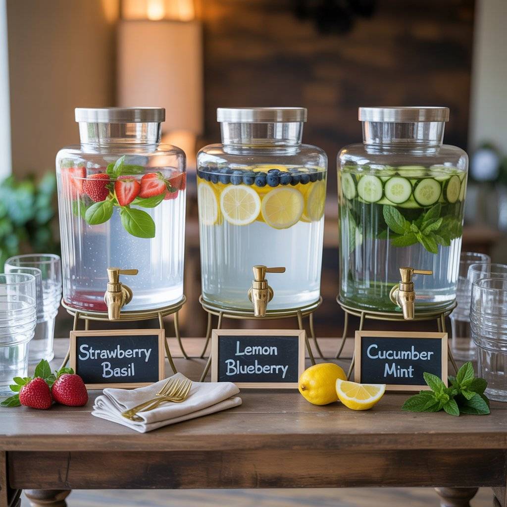 Alongside your cocktails and sodas, set up a dedicated water station with large glass dispensers filled with fruit-infused water. Combinations like strawberry and basil, lemon and blueberry, or cucumber and mint look beautiful and taste refreshing.