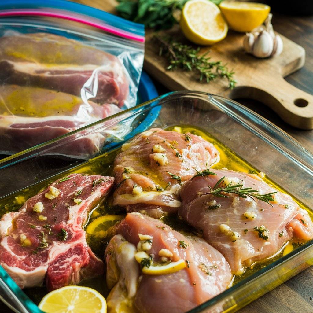 Whether it’s chicken thighs, skirt steak, or pork chops, letting meat sit in a marinade overnight allows the flavors to really penetrate. You can whip up a simple marinade with olive oil, garlic, citrus juice, and fresh herbs in about five minutes.