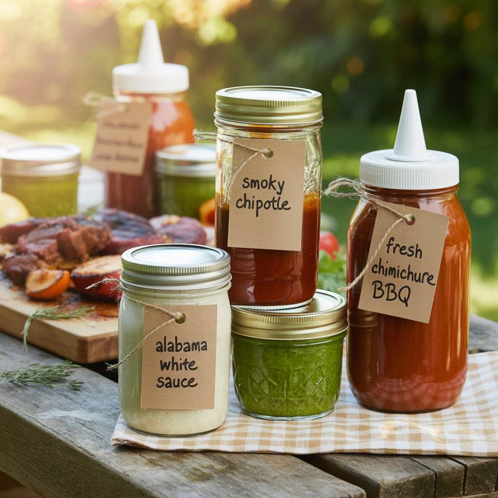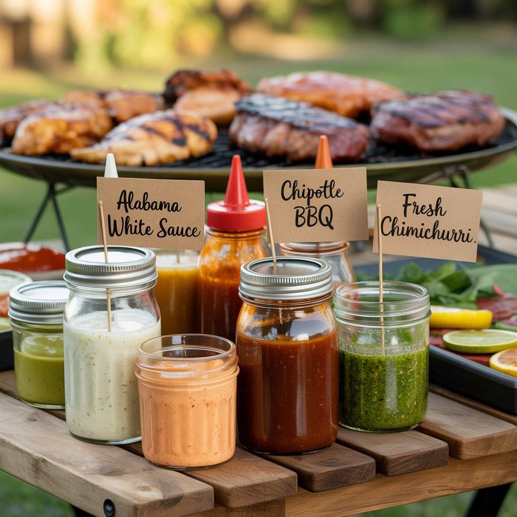 A tangy Alabama white sauce is great for chicken, a smoky chipotle BBQ sauce works on everything, and a fresh chimichurri adds brightness to steak. Put them in squeeze bottles or small mason jars with labels so guests know what they’re getting.