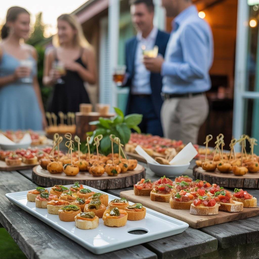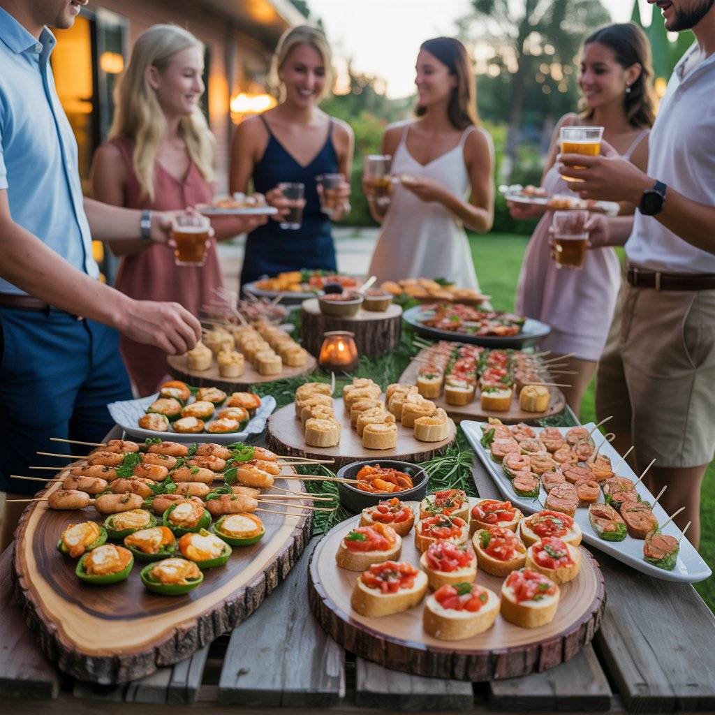 When guests first arrive, they’re usually standing around, catching up, and holding a drink. Make it easy on them by serving appetizers that are easy to grab with one hand. Think grilled shrimp skewers, stuffed jalapeño poppers, or bruschetta on toasted baguette slices.